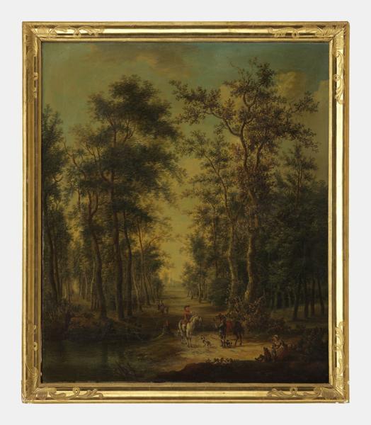Chemin bordé d'arbres avec chevaliers, huile sur toile, 48x42 cm