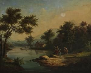 Deux paysages fluviaux animés, paire d'huiles sur toile, 48x58 cm