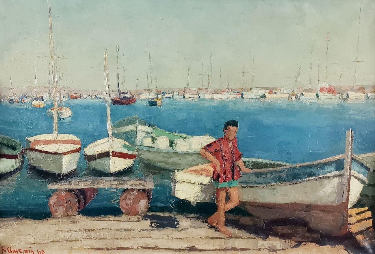 Barques au Lavanchy, huile sur toile, signée Roger Clavequin et intitulée au verso, 38x55 cm