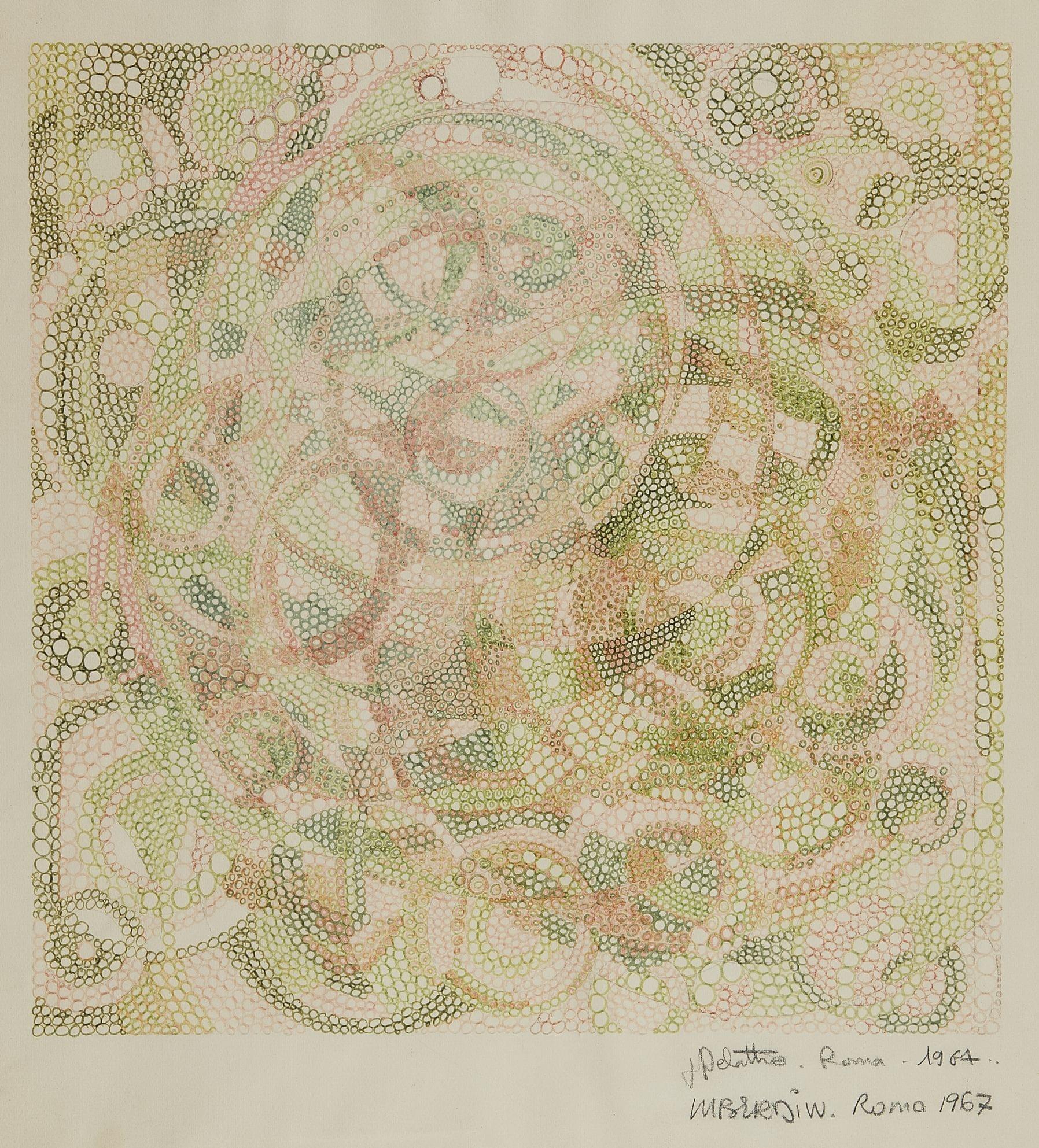 Composition abstraite, crayon de couleur, signée, localisée Roma, datée 1967, 56x48 cm