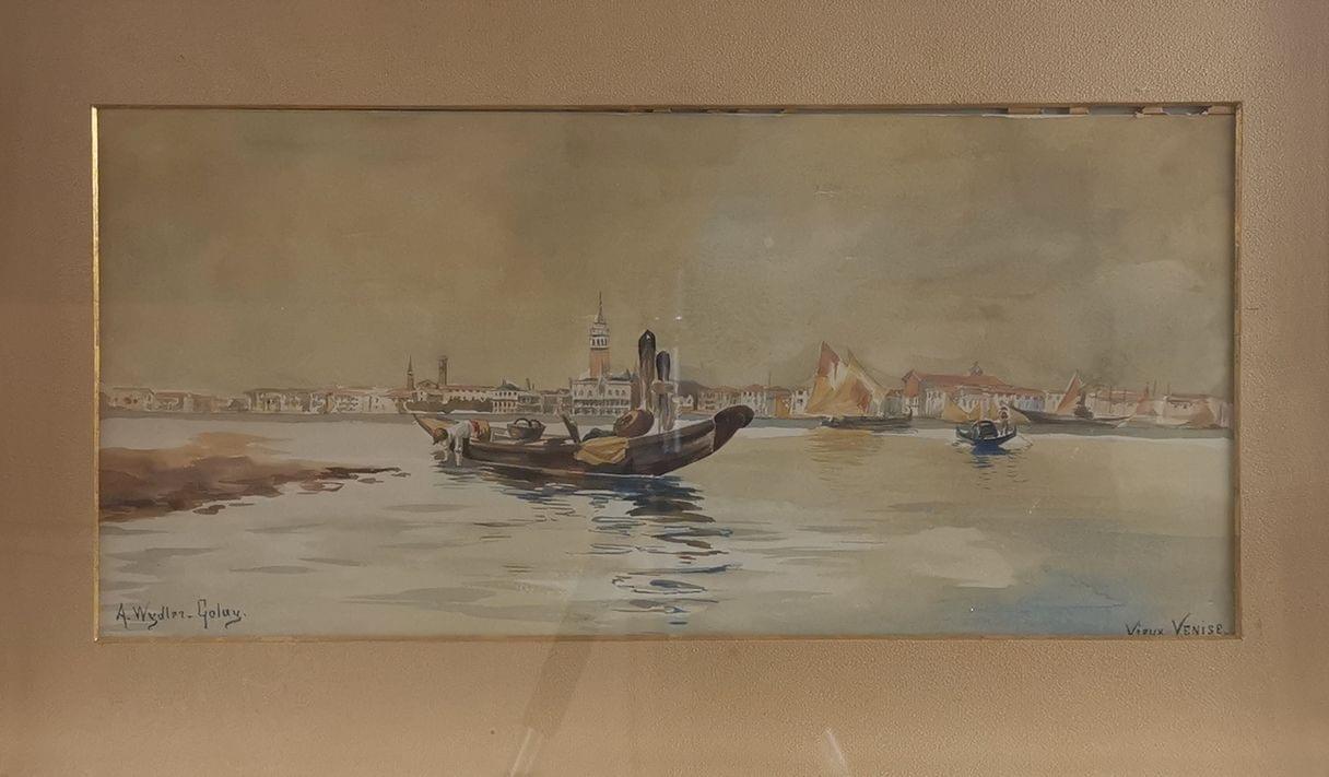 Vue de Venise, aquarelle et gouache sur papier, signée A. Wydler-Golay, 24x50 cm