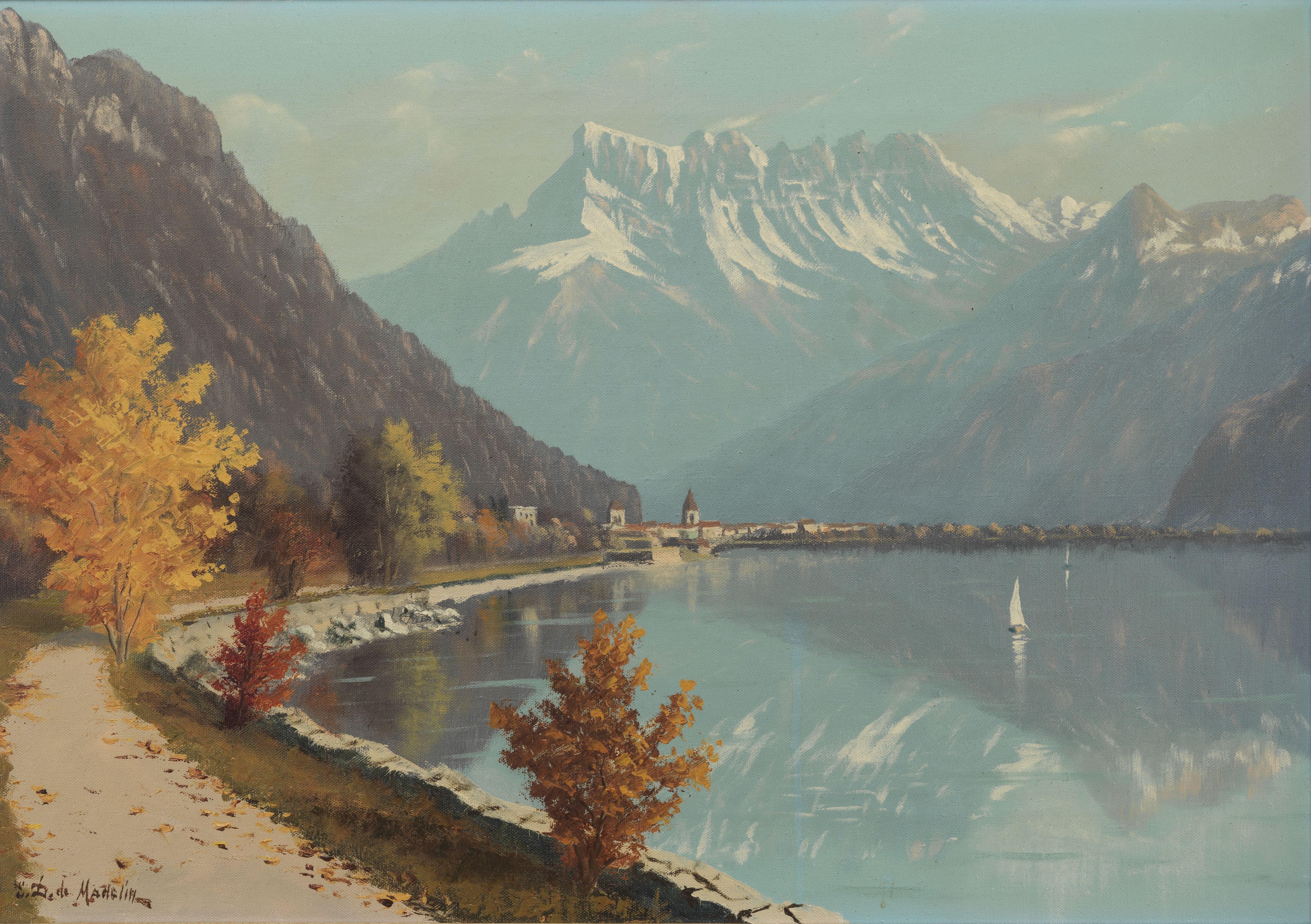 Vue du lac, huile sur toile, signature illisible, 42x60 cm