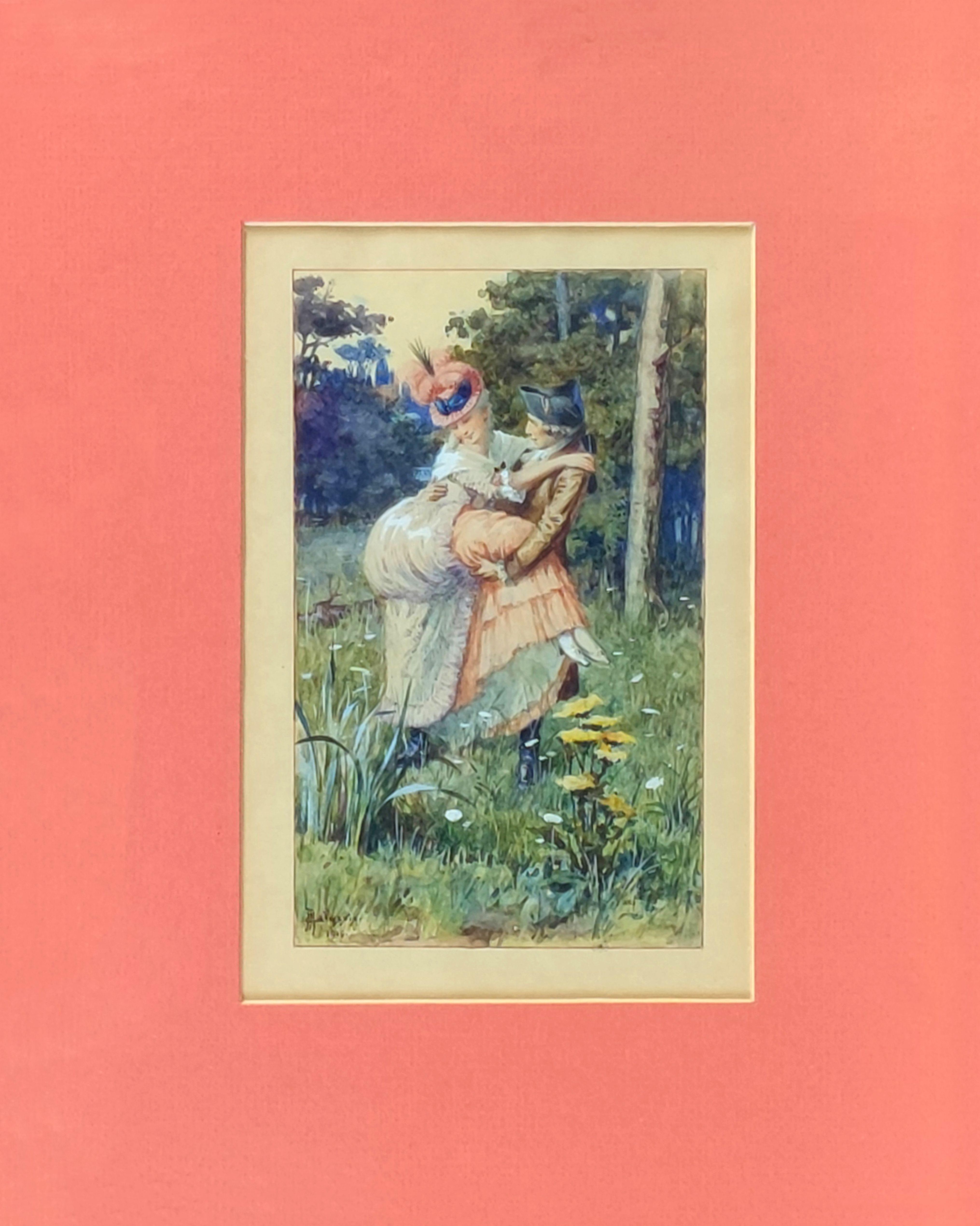 Scène romantique, aquarelle sur papier, signature illisible, datée 1916, 16x10 cm