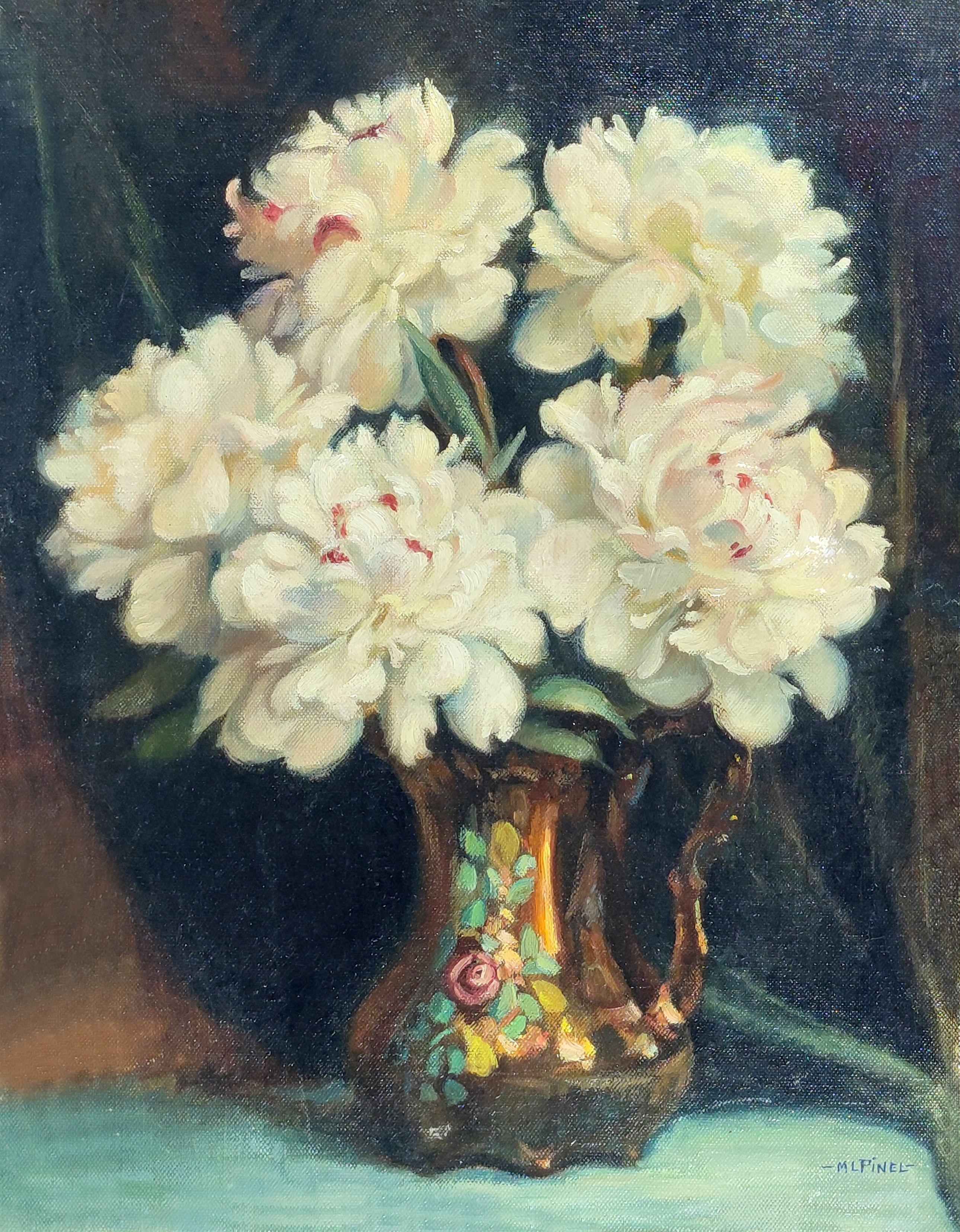 Bouquet de fleurs blanches, huile sur toile, signée Pinel, 50x39 cm