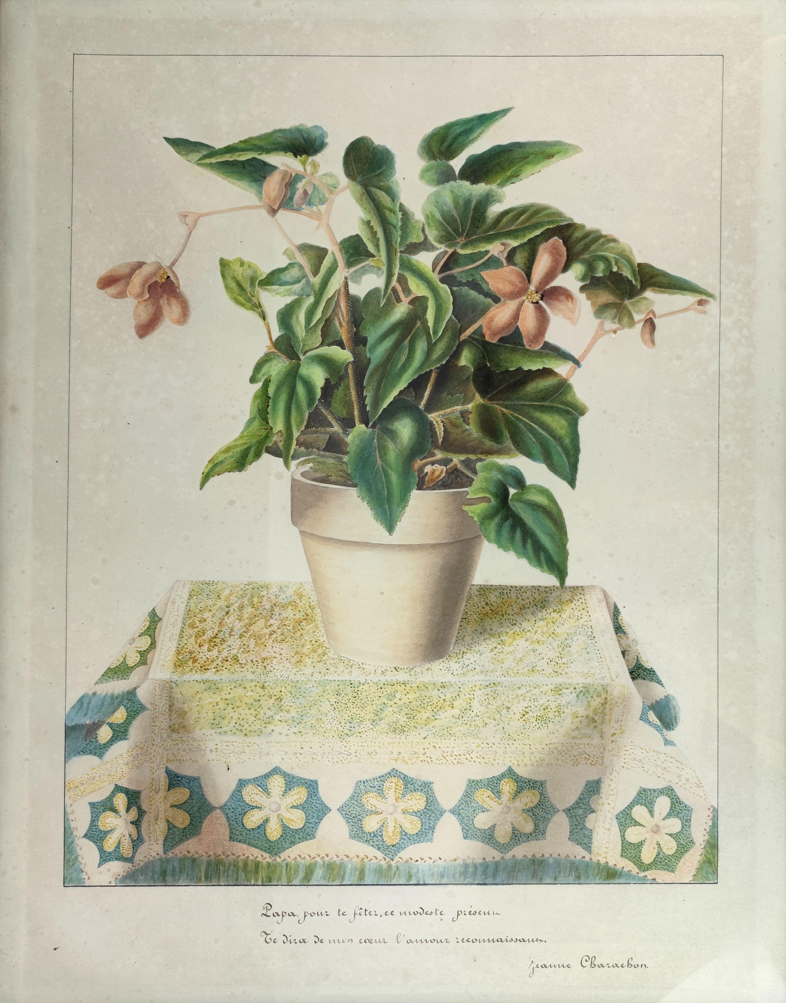 Fleurs en pot, paire d'aquarelles sur papier, signées Jeanne Charachon et dédicacées, 35x45 cm