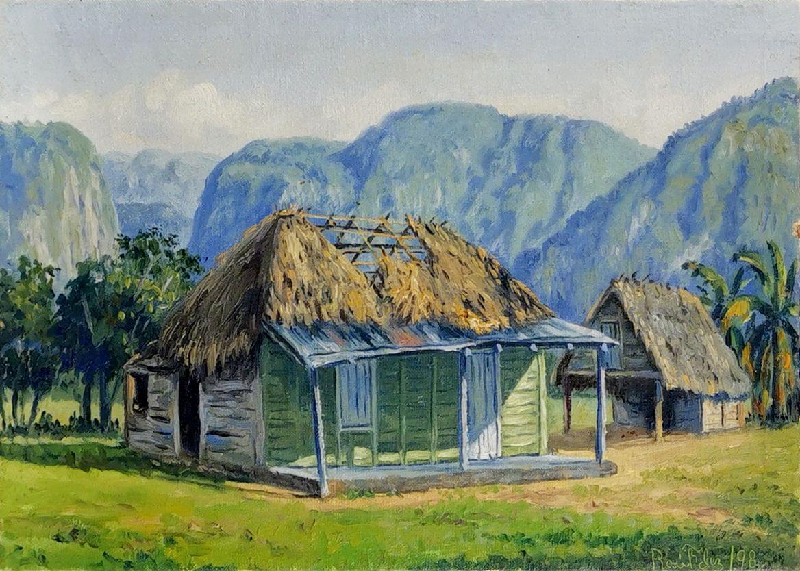 Paysage avec cabanes, huile sur toile, signature illisible, 20x28 cm