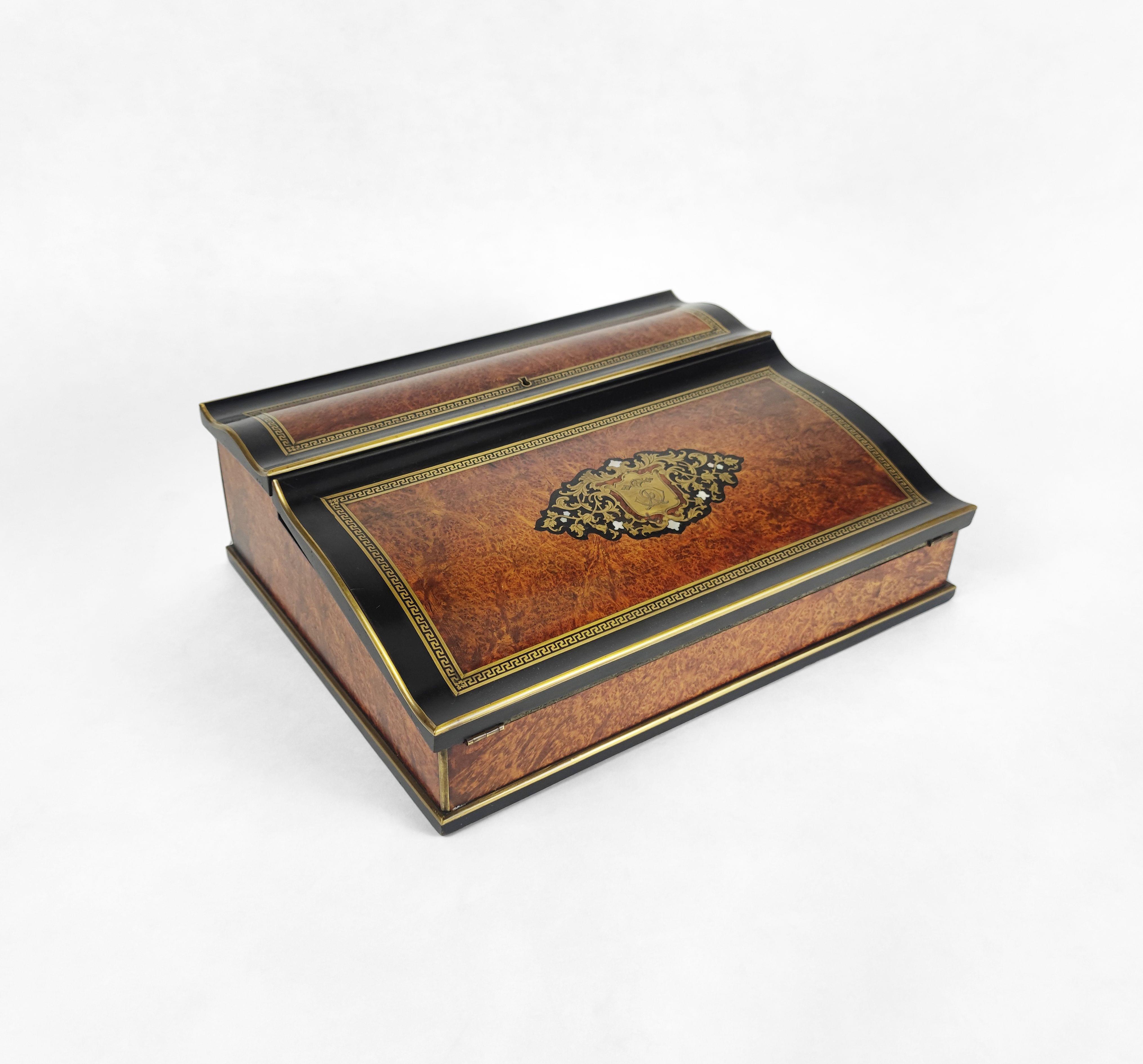 Bois de loupe, filets de laiton et bois noirci à motif d'un monogramme, 12x36x28 cm