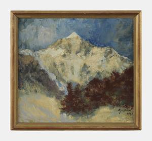 Montagne des Grisons dans les nuées, huile sur pavatex, signée et datée 1947, 36x40 cm