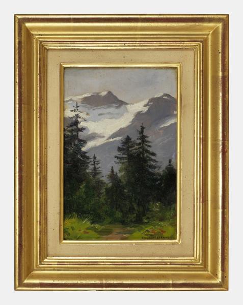 Vue de montagne, huile sur panneau, signée, 34x16 cm