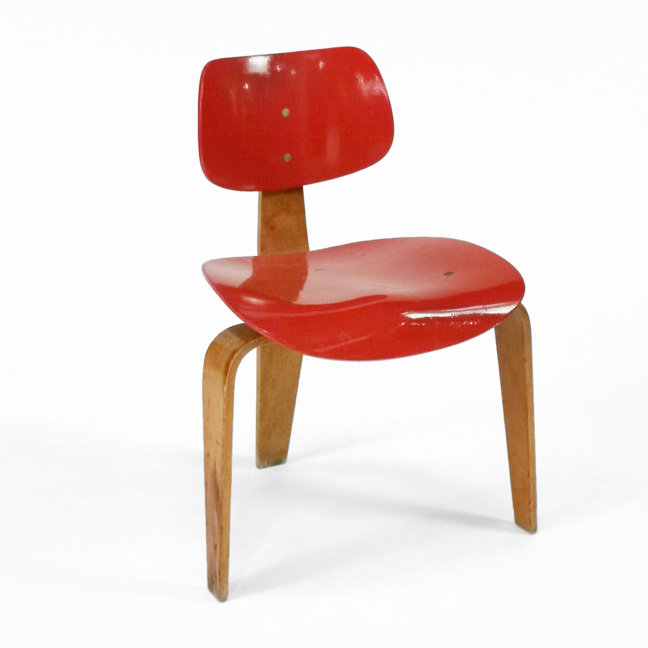 Chaise, modèle SE 42, bois au naturel et bois laqué rouge, étiquette au dos DBP Weitere Schutzrechte angemeldet