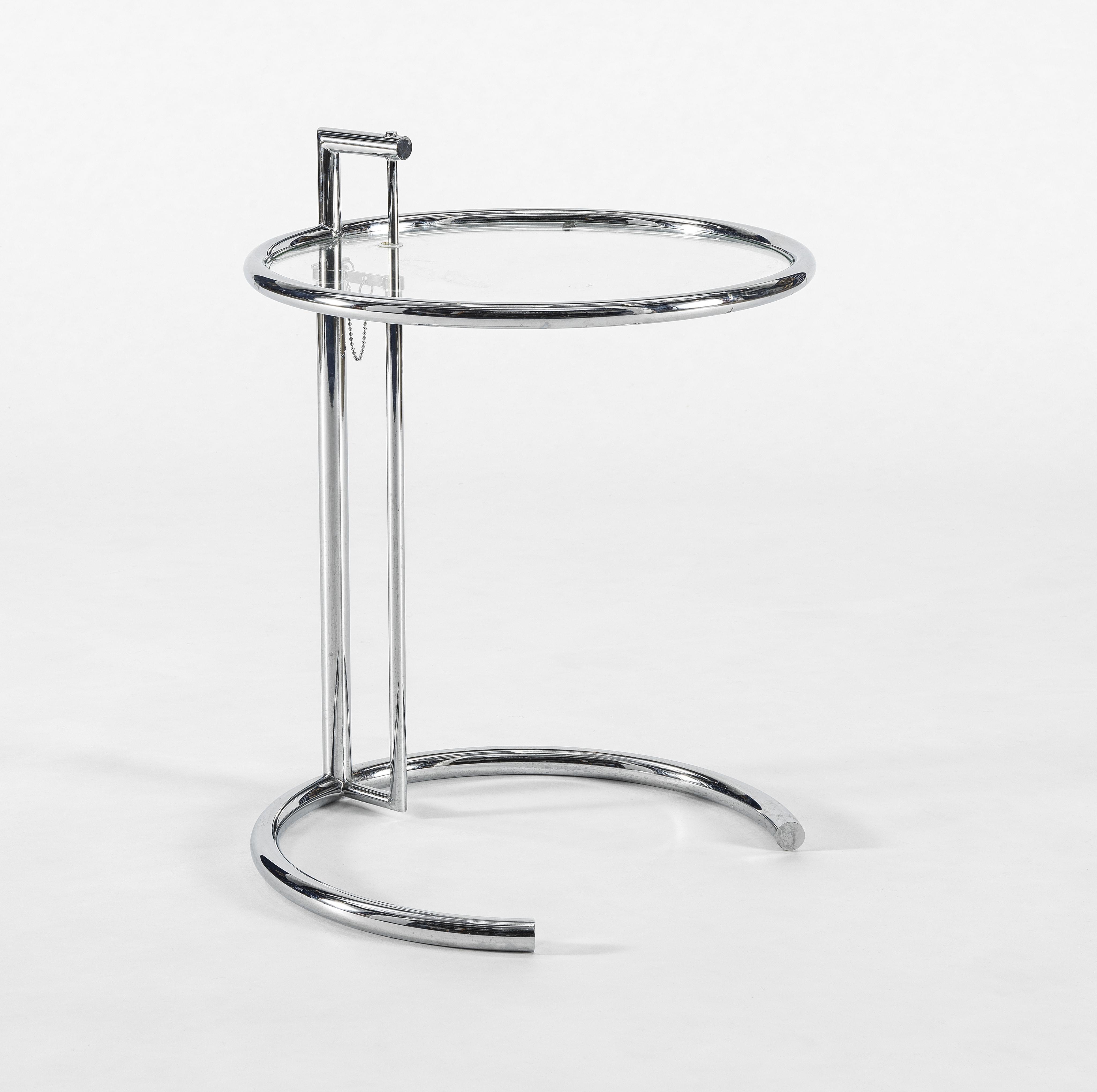 Table d'appoint ajustable E 1027, acier chromé et verre, H 75 cm.