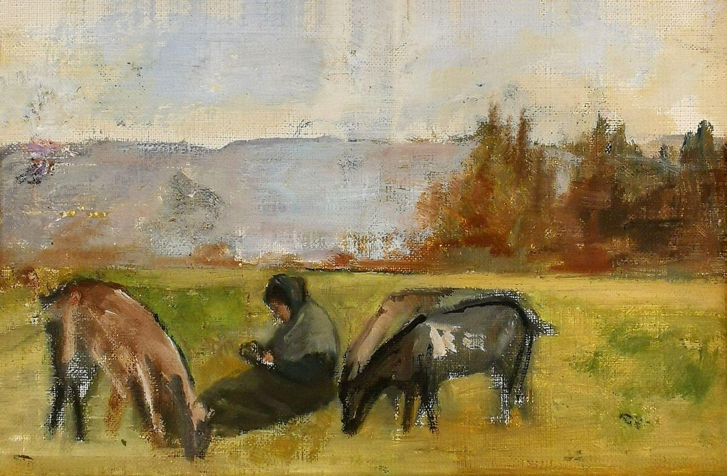 Bergère et chèvres, huile sur toile marouflée sur carton, 14x22 cm