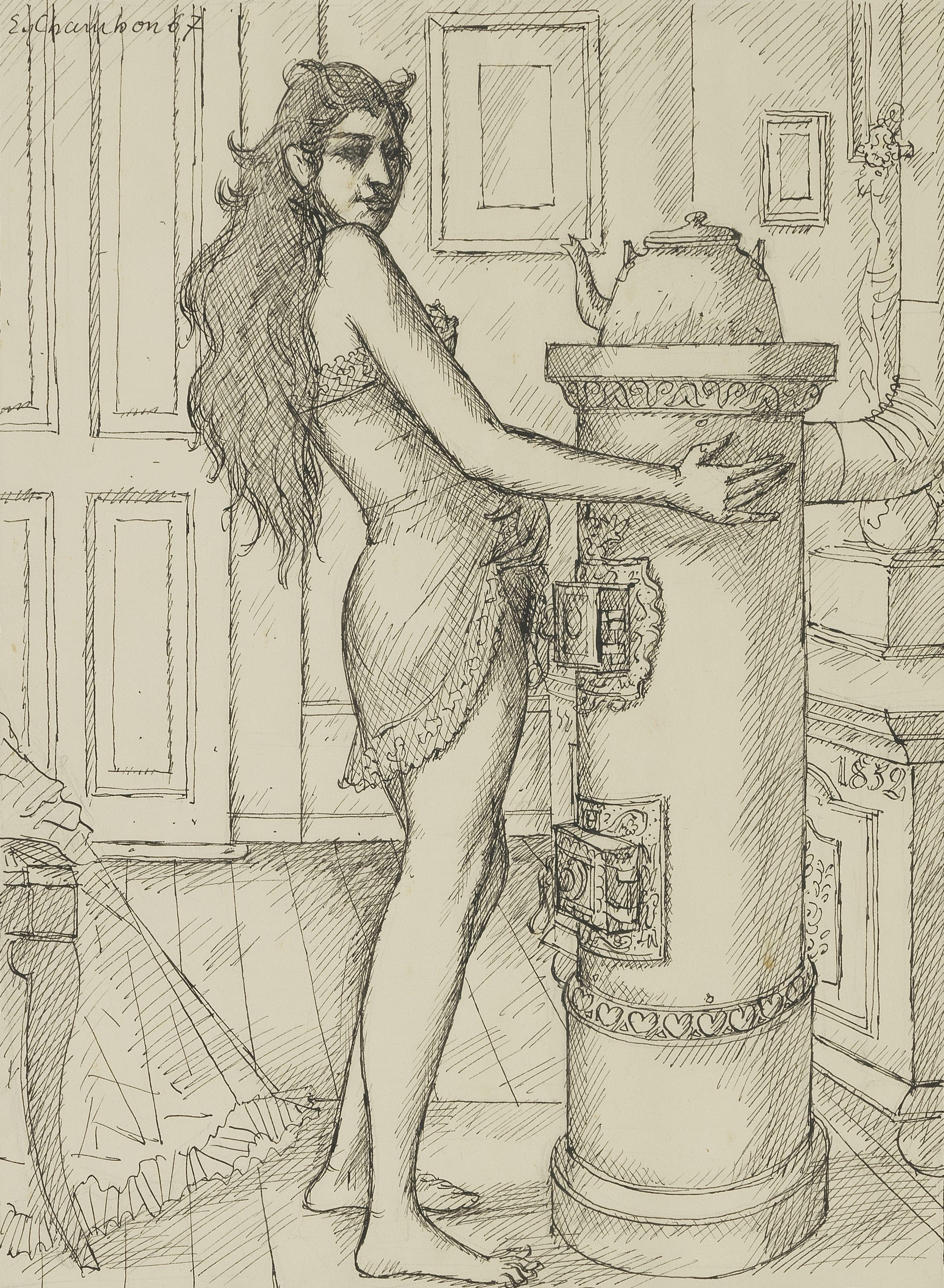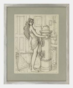 Femme au coin du poêle, encre sur papier, datée 67, 40x30 cm