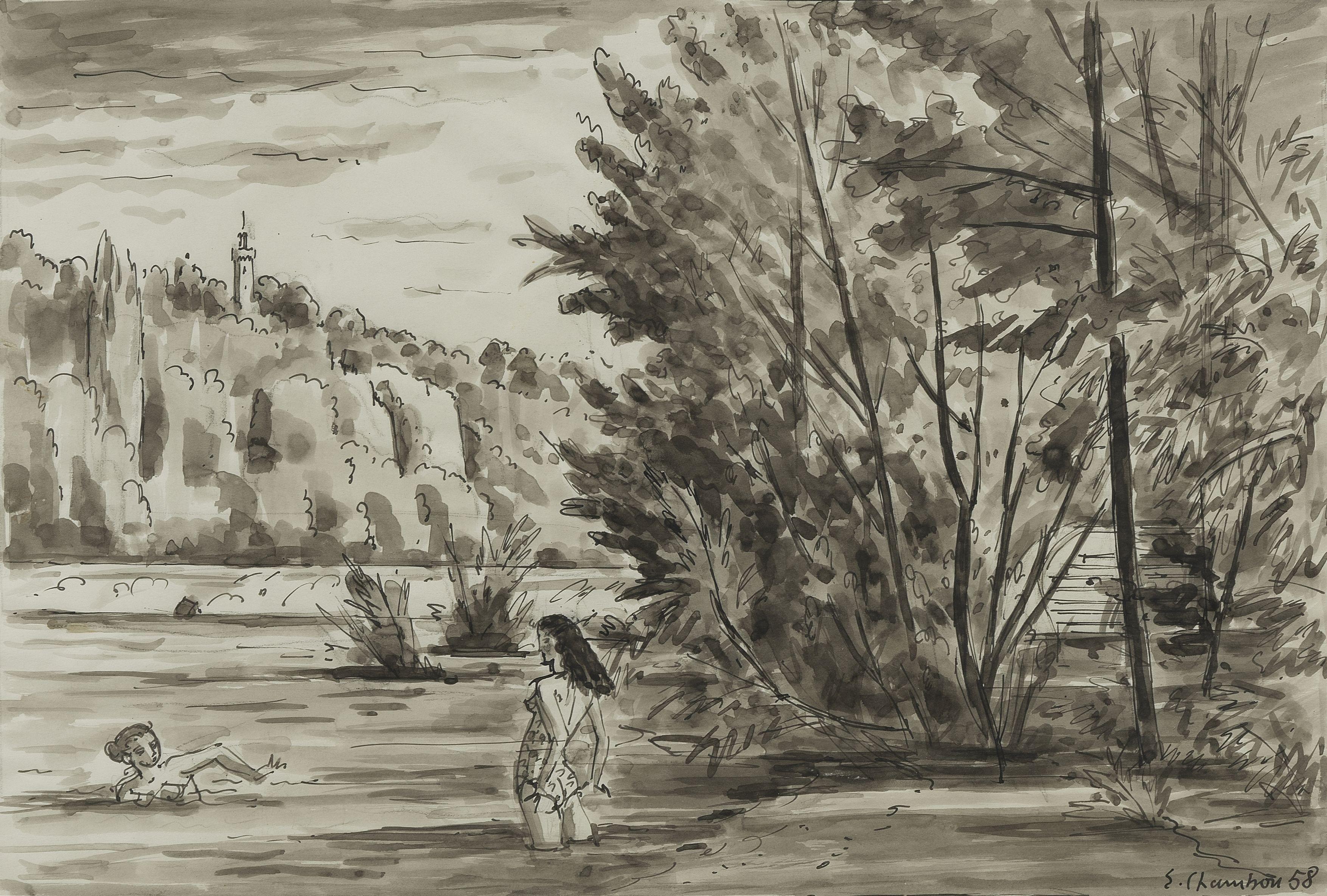 Personnages au bord d'un étang, huile sur panneau, signée, 39x46...