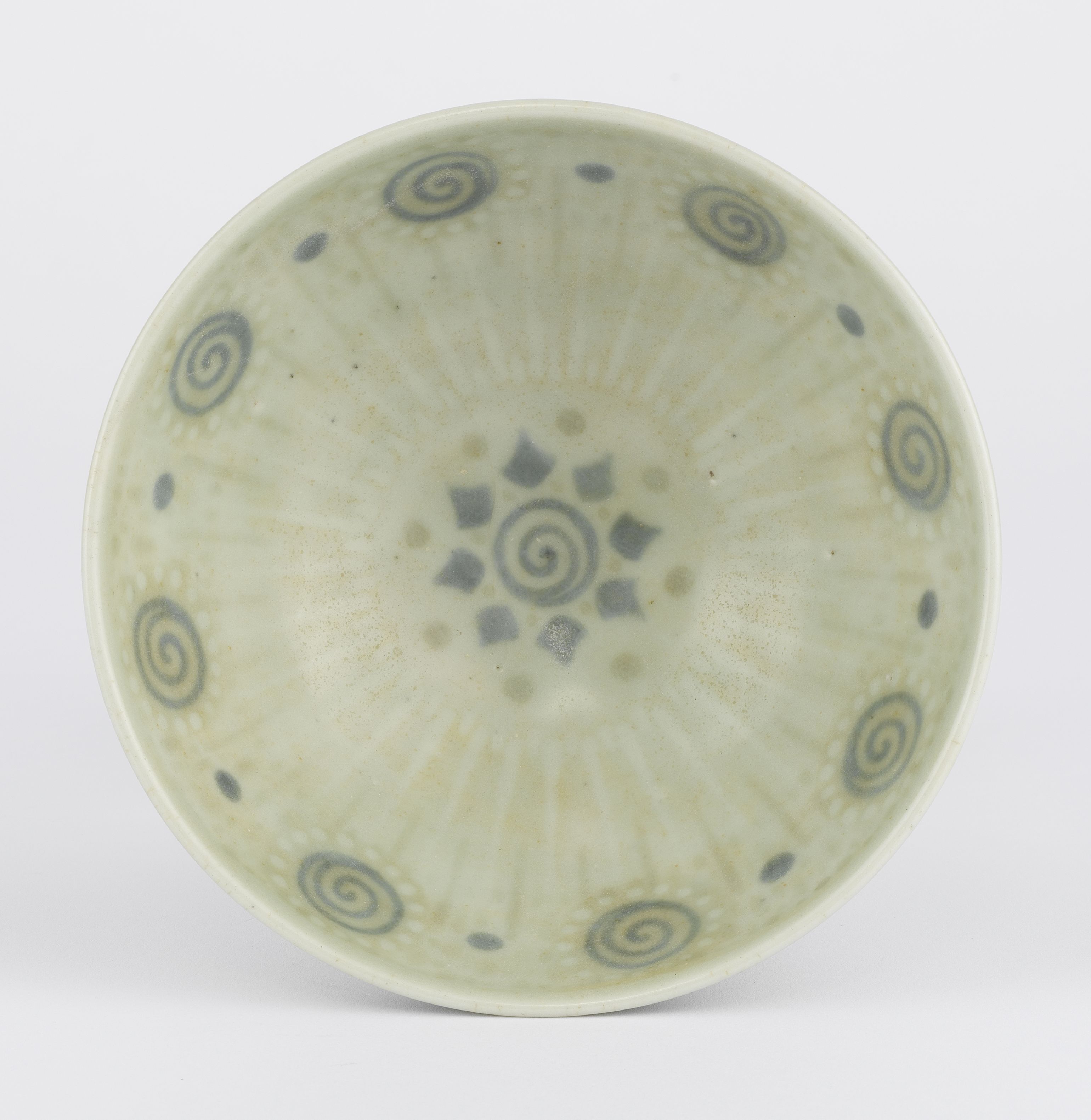 Coupe sur pied à motif de fleurons, porcelaine émaillée céladon, signée, H 14,5 cm. Provenance: Les Stern, une famille de collectionneurs.