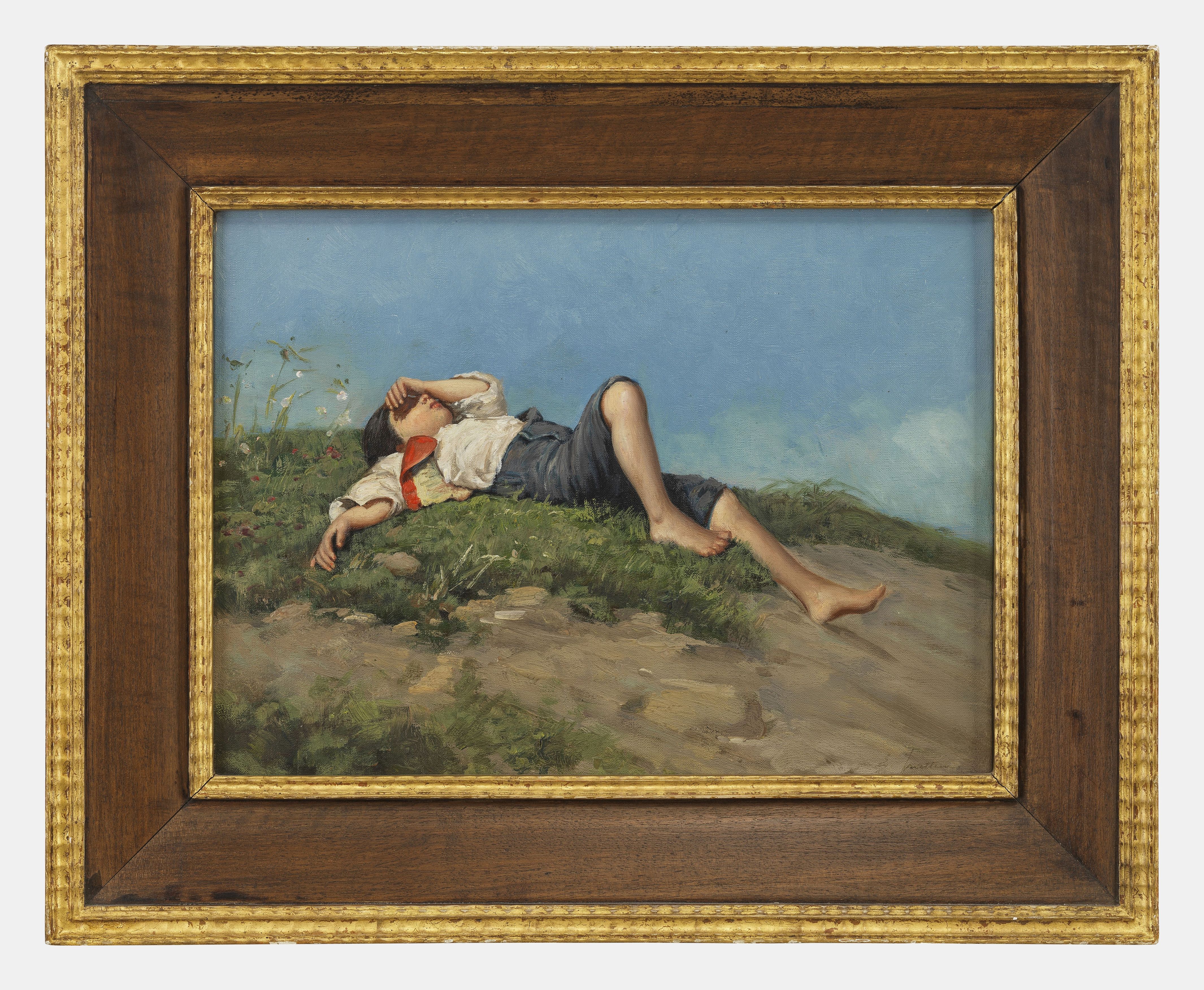 Jeune homme allongé dans l’herbe, huile sur toile, signée, 29x39 cm