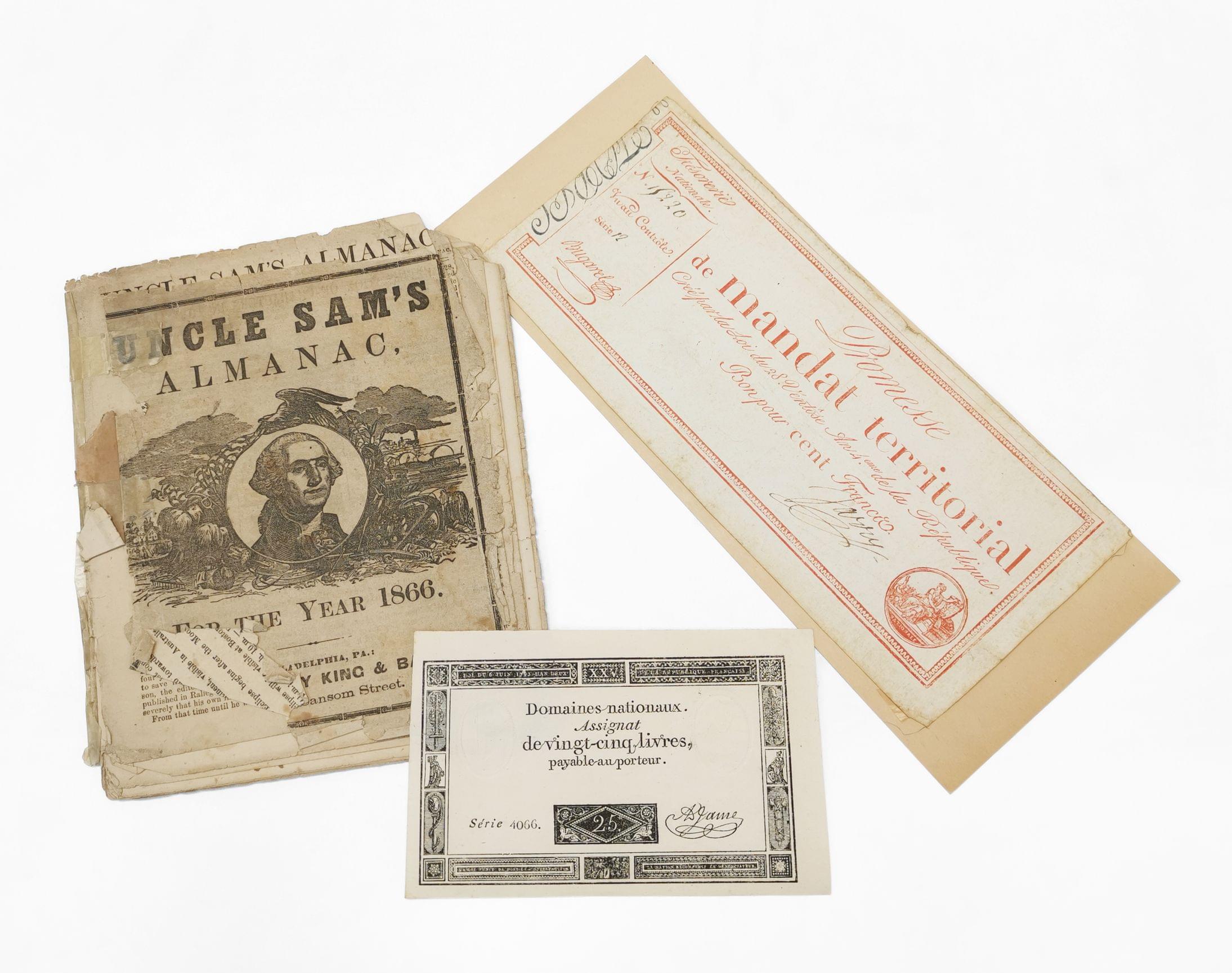 Un assignat de 25 livres ; une promesse de mandat territorial de 100 Francs, signé Jarry à l’encre noire ; Uncle Sam’s Almanac for the Year 1866, in 8° broché (état défraîchi).