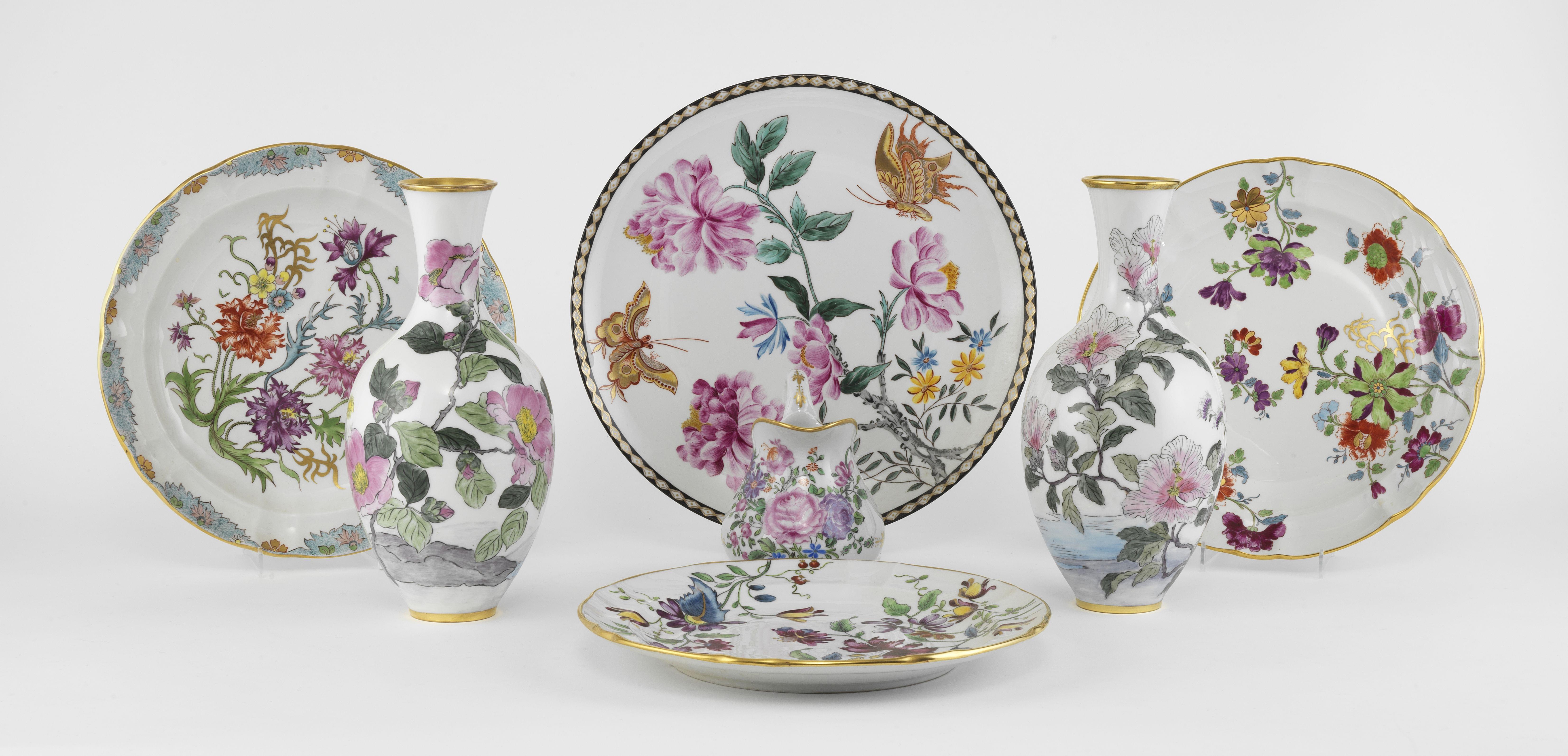 Décor peint à la main par Renée Rapin dans le style de la Compagnie des Indes, porcelaine, comprenant: 2 vases, 1 verseuse et 4 plats, H 29 et D 33 cm