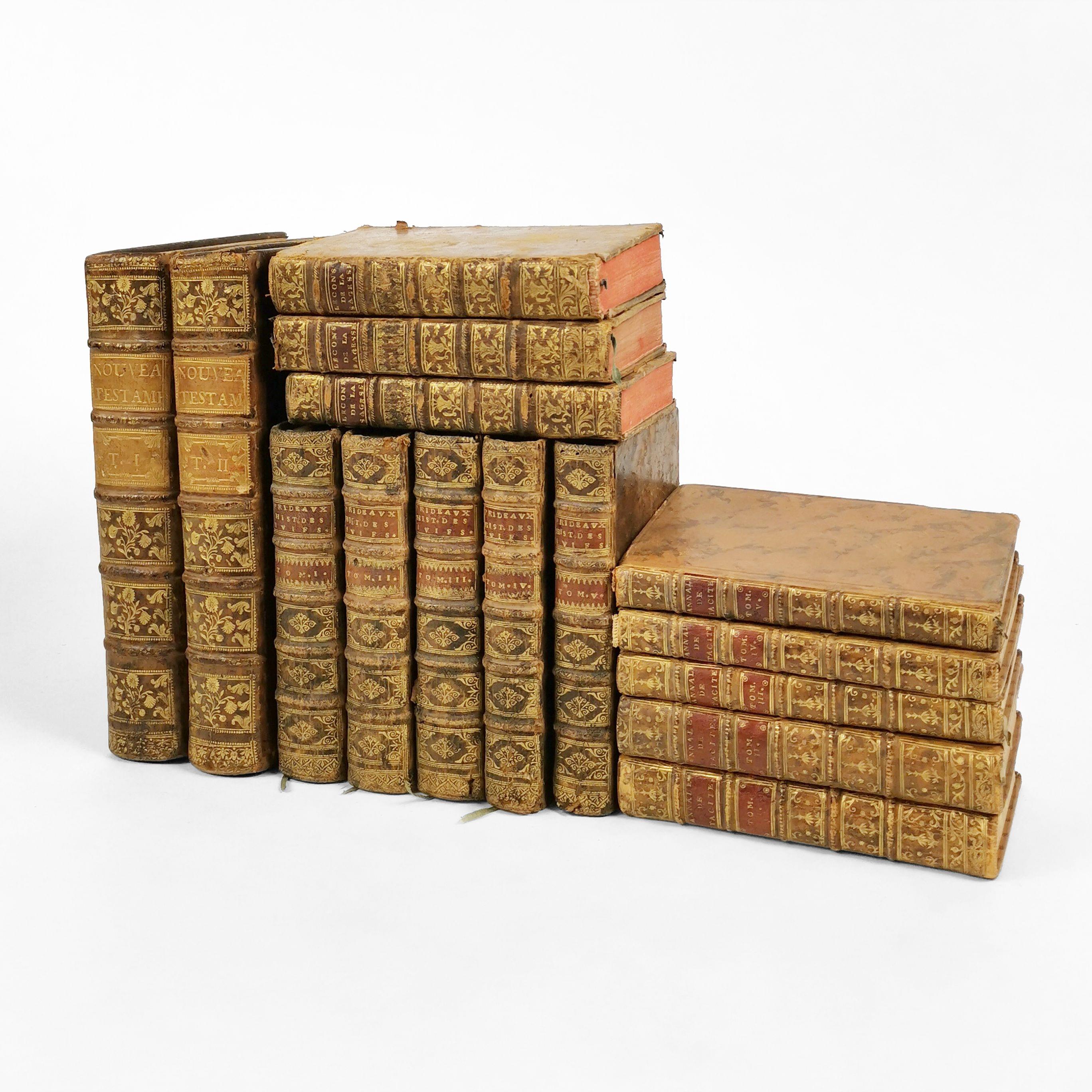 - Le Nouveau Testament de Notre Seigneur Jésus Christ. Lausanne, Zimmerli, 1735 ; deux vol. in 4°, veau fauve moucheté, dos à nerfs ornés, filet doré sur les plats, tr. rouges. Reliure de l’époque. - TACITE : Annales de Tacite. Règnes de Claude et de Néron. Paris, Moutard, 1774 ; cinq vol. in 12, veau blond orné de l’époque. - DEBONNAIRE : Les Leçons de la sagesse. Paris, Briasson, 1758 ; trois vol. in 12, basane ornée de l’époque.- Auli Persii Flacci Satyrae. Berne, Wagner, 1765 ; in 12, cartonnage moderne. Nombreuses figures gravées H. T. et in texte. ...PRIDEAUX : Histoire des Juifs et des Peuples voisins.. Amsterdam, Henri du Sauzet, 1722 ; cinq vol. in 12, basane brune ornée de l’époque. Front. et cartes gravés.