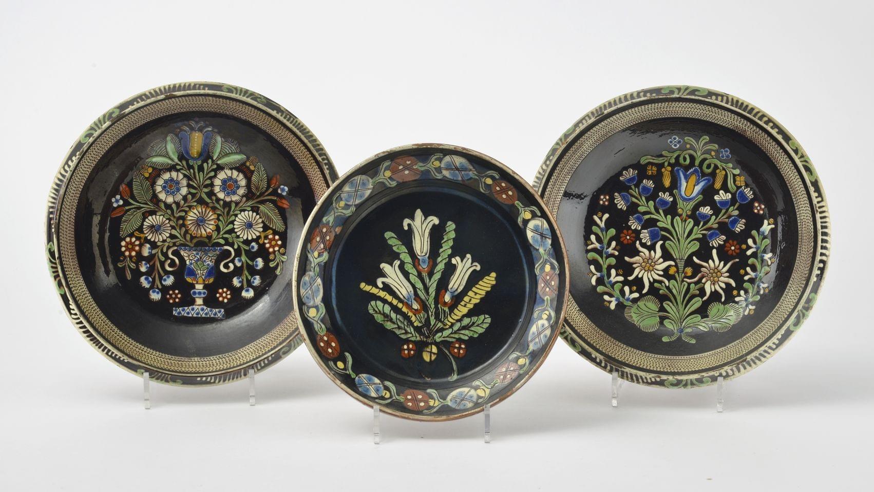 Terre vernisée à décor central d'un bouquet de fleurs stylisées, émaux polychromes, fond brun, non signées D 25,5 et 30 cm.