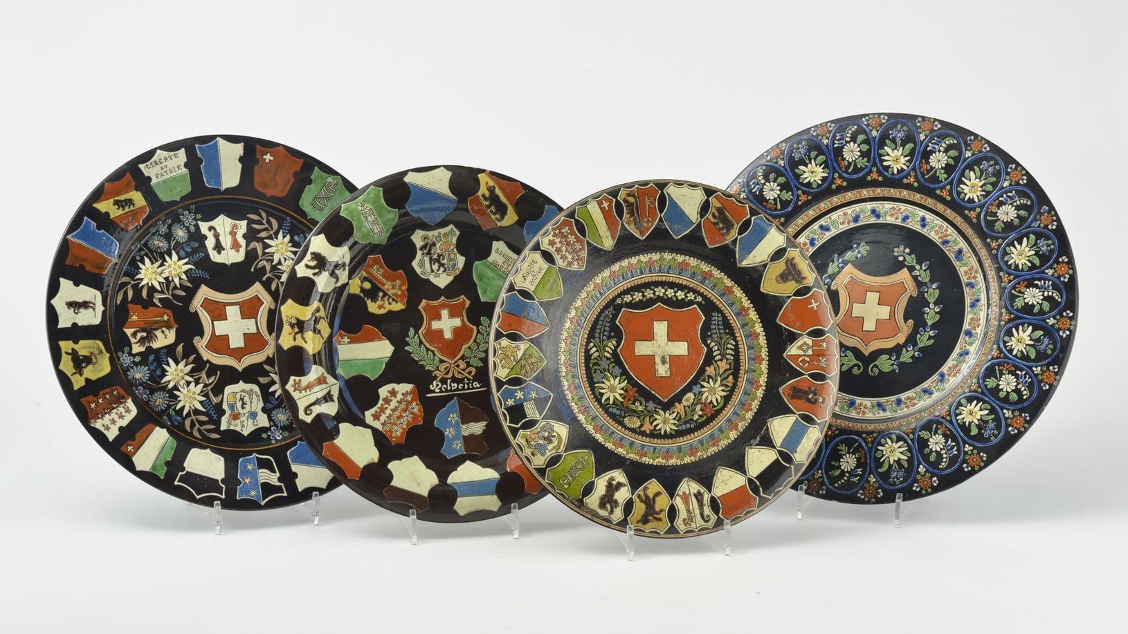 Terre vernissée à décor central aux armes de la Confédération Helvétique, fond brun, une signature "Thoune". D 41; 39,5; 36 et 36,5cm.