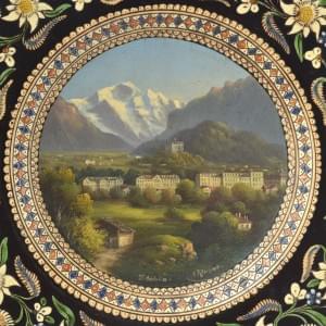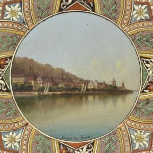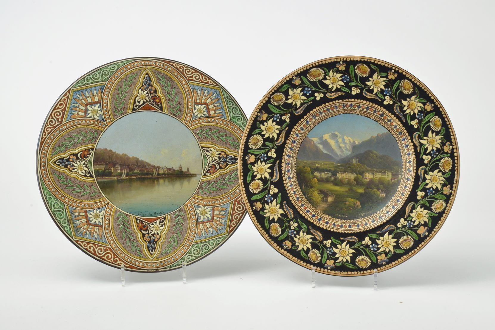 Terre vernissée à décor incisé de fleurs, centre peint de vues d'Interlaken et Evian les Bains, Thoune XIXe s, D 36 cm