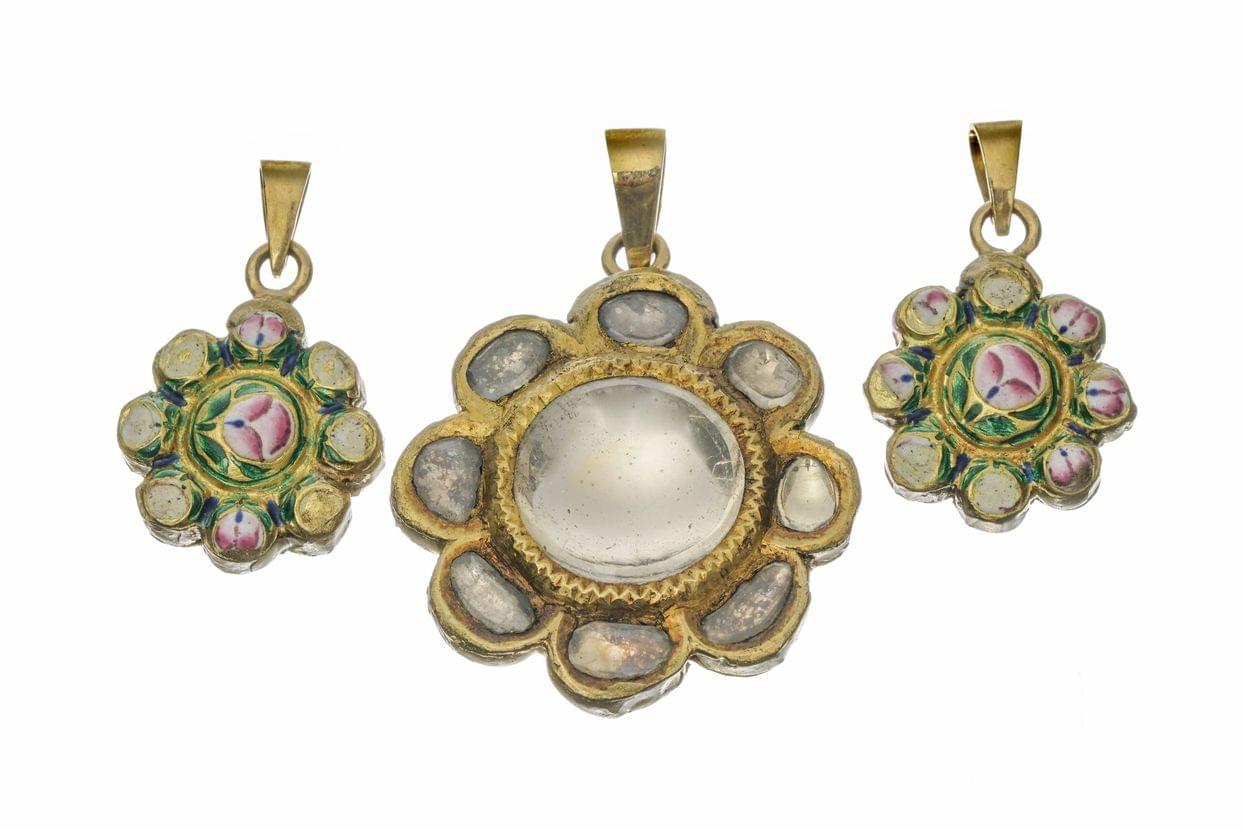 3130. Ensemble de trois pendentifs sertis de saphirs blancs et de cristal de roche sur paillon et émaillés d'un décor floral au revers
