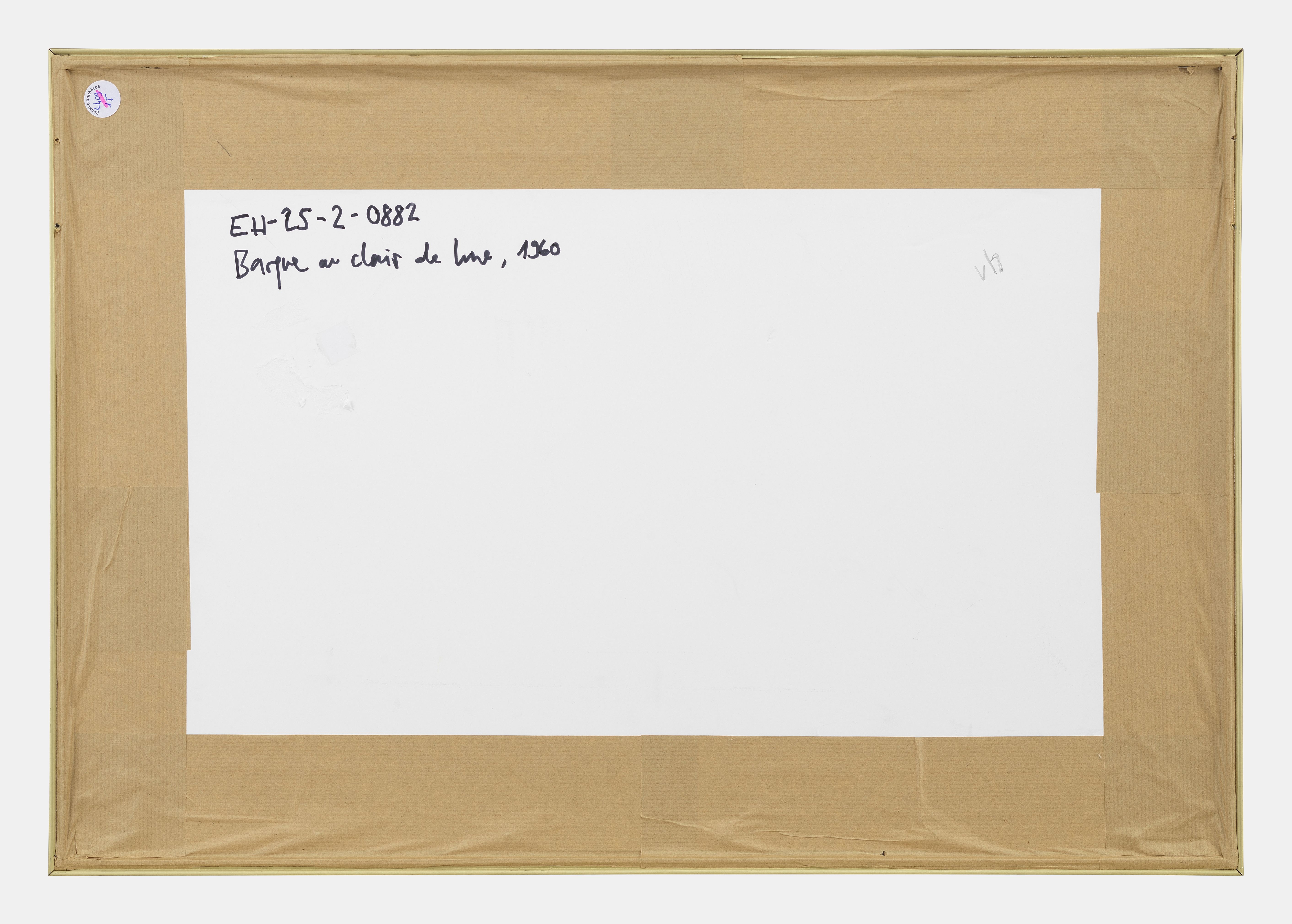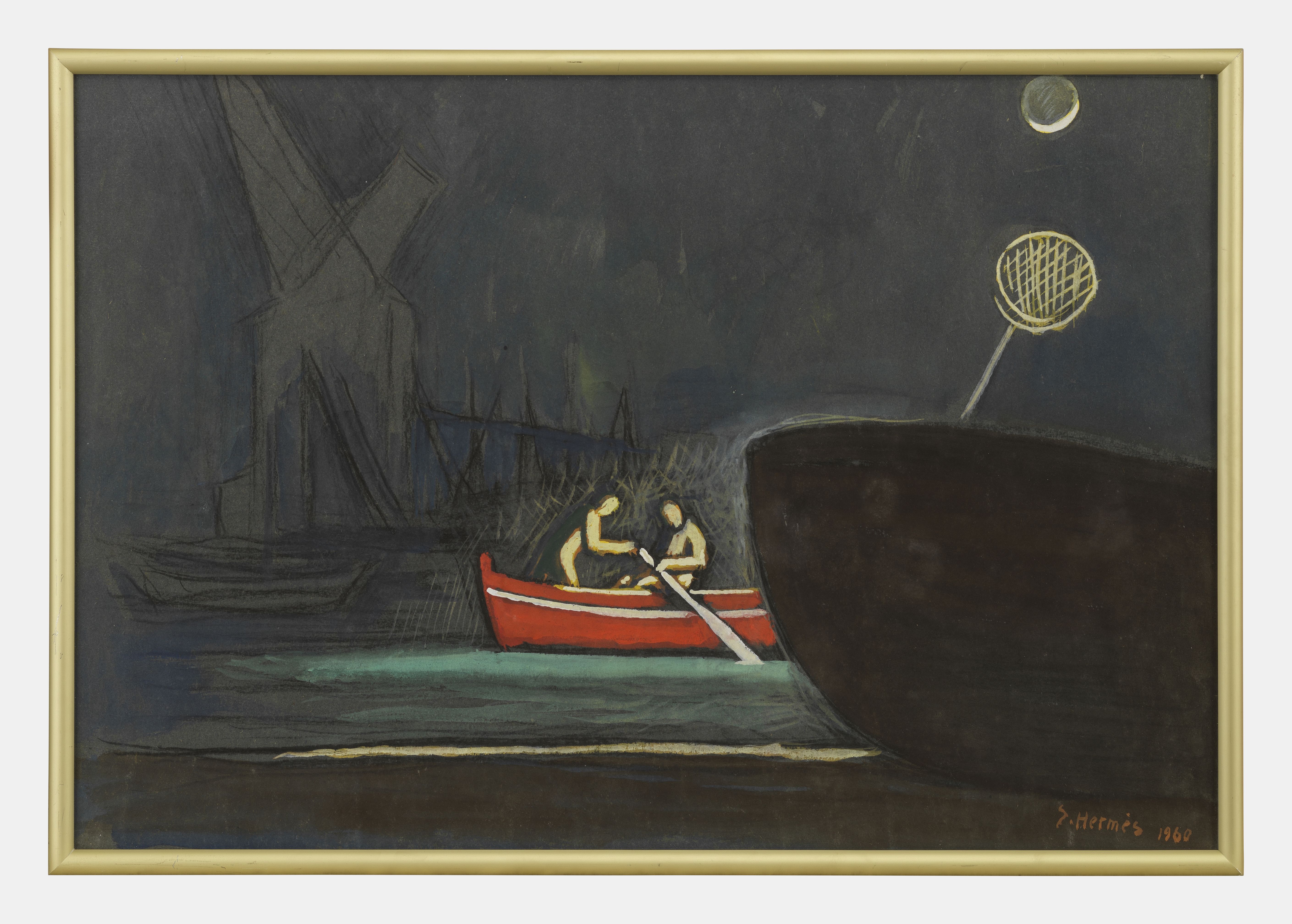 Barque au clair de lune, fusain et gouache sur papier, signé et daté 1960, 41x62,5 cm
