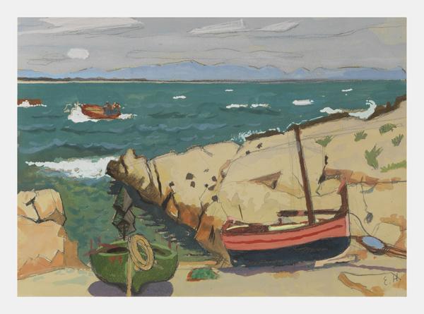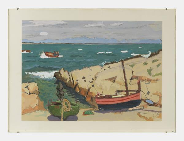 Pêcheurs au port et barques sur la plage, deux gouaches et fusain sur papier, l'une signée et l'autre monogrammée, 24x33,5 cm et 25x30 cm