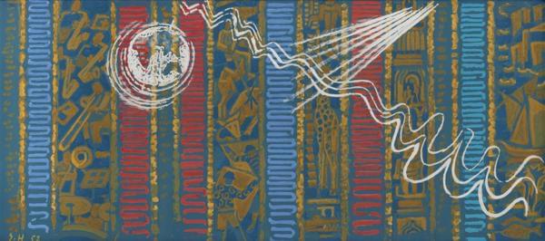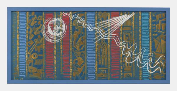 Deux projets de décor à motif du globe terrestre et de la tour Eiffel, paire de peintures à l'eau sur toile, monogrammés et datés 52, 27x60 cm