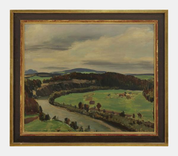Paysage de montagne, huile sur panneau, signée et datée 52, 32x4...