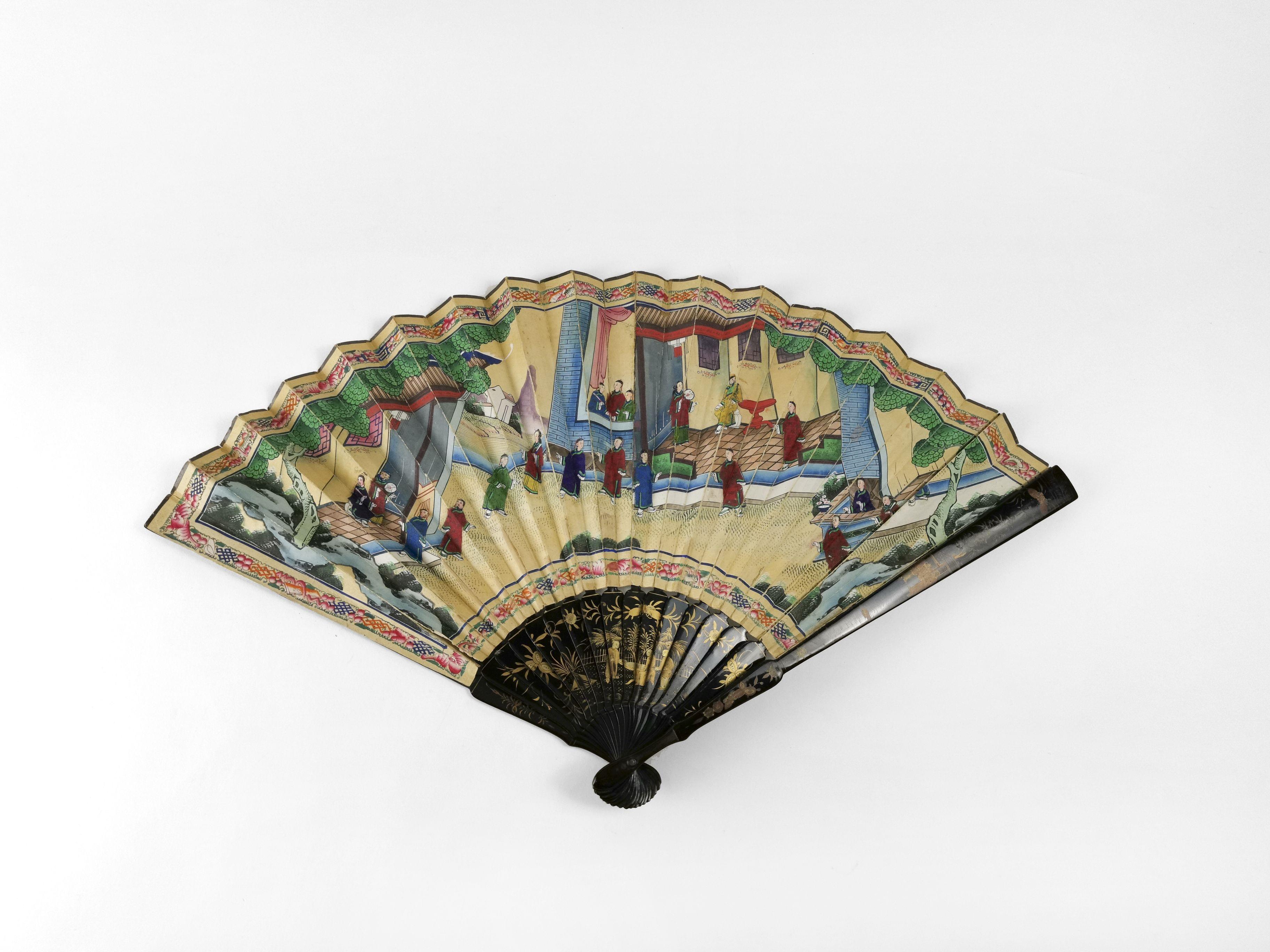 A décor de scène de palais, brin en laque noire et or, L 35 cm