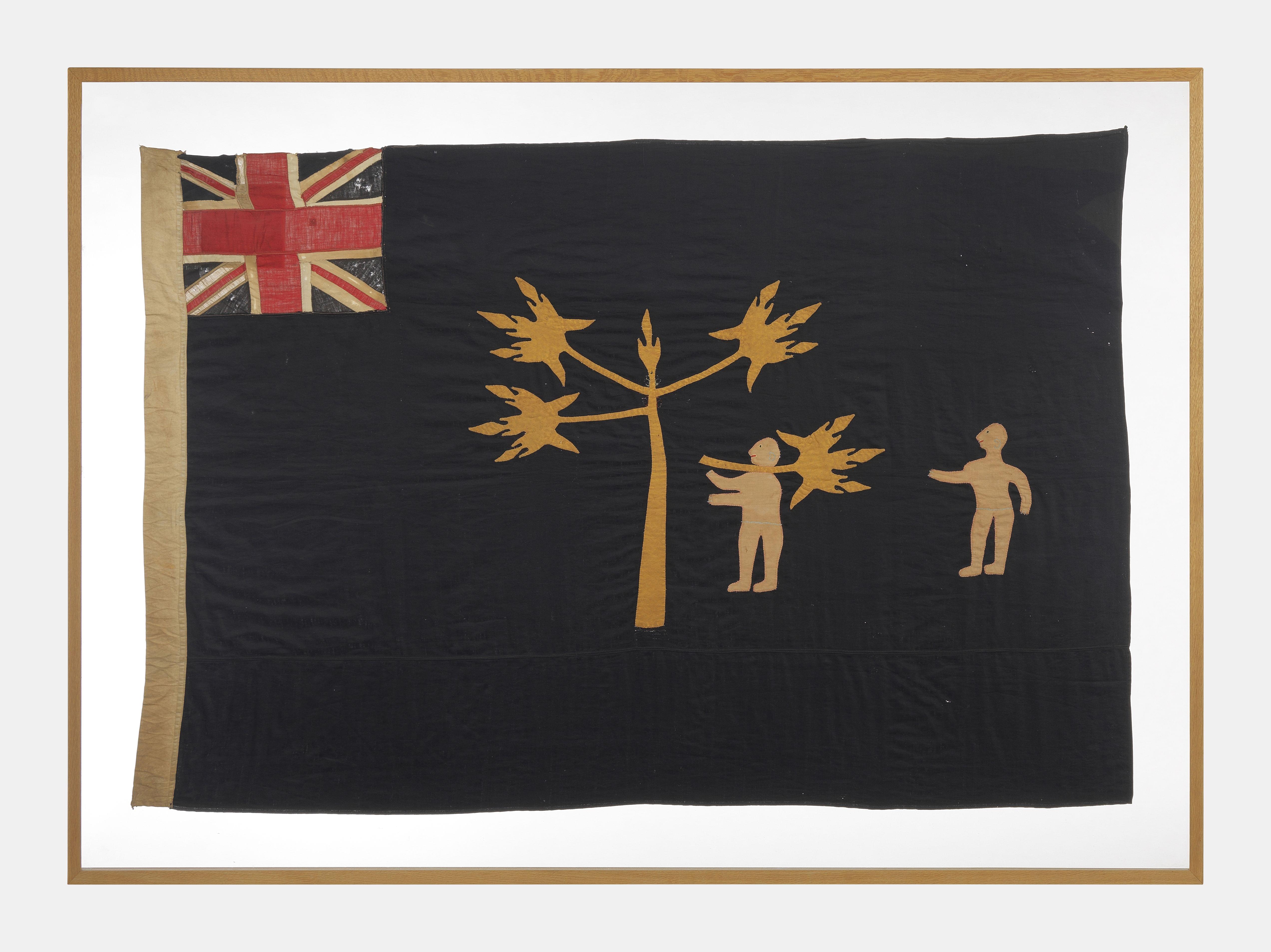Les autruches, drapeau à décor d'un homme et trois autruches sur...