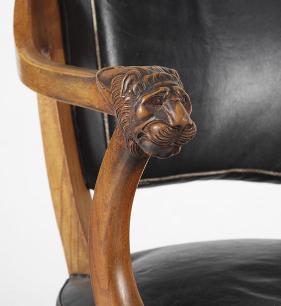 Accotoirs à tête de lion, assise pivotante, bois au naturel et cuir
