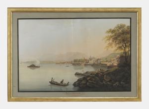 Vue de Neuchâtel de l'Est, gravure gouachée et aquarellée, datée 1818, 41x63 cm