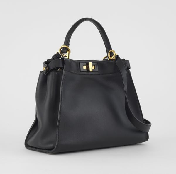 Cuir de veau noir et surpiqûres, garniture en métal doré, fermoir pivotant, intérieur à deux soufflets avec une poche latérale zippée, anse, bandoulière amovible, env. 25x34x13 cm