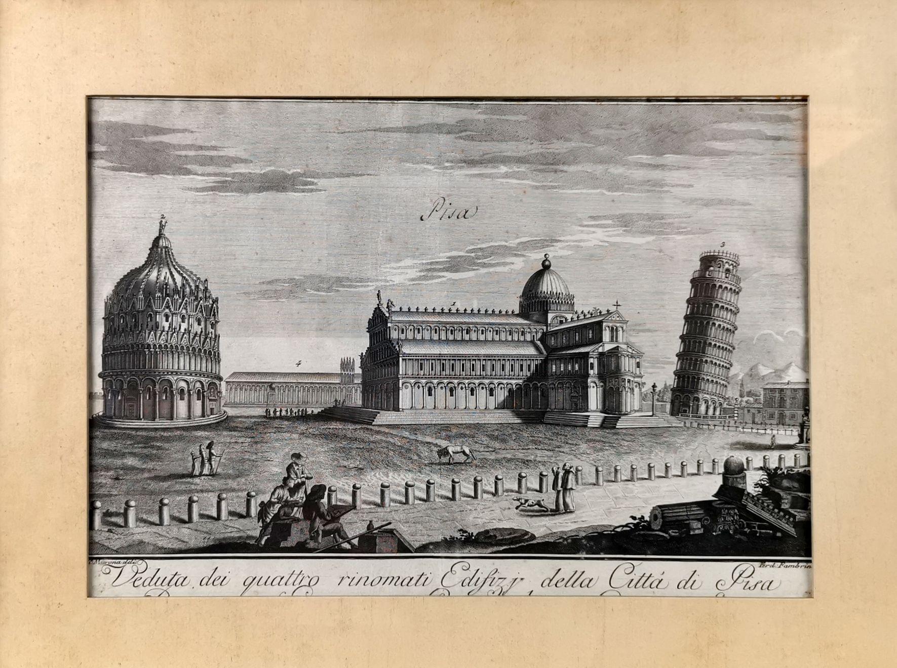 Vue des quatre bâtiments renommés de la ville de Pise, gravure, 25x36 cm