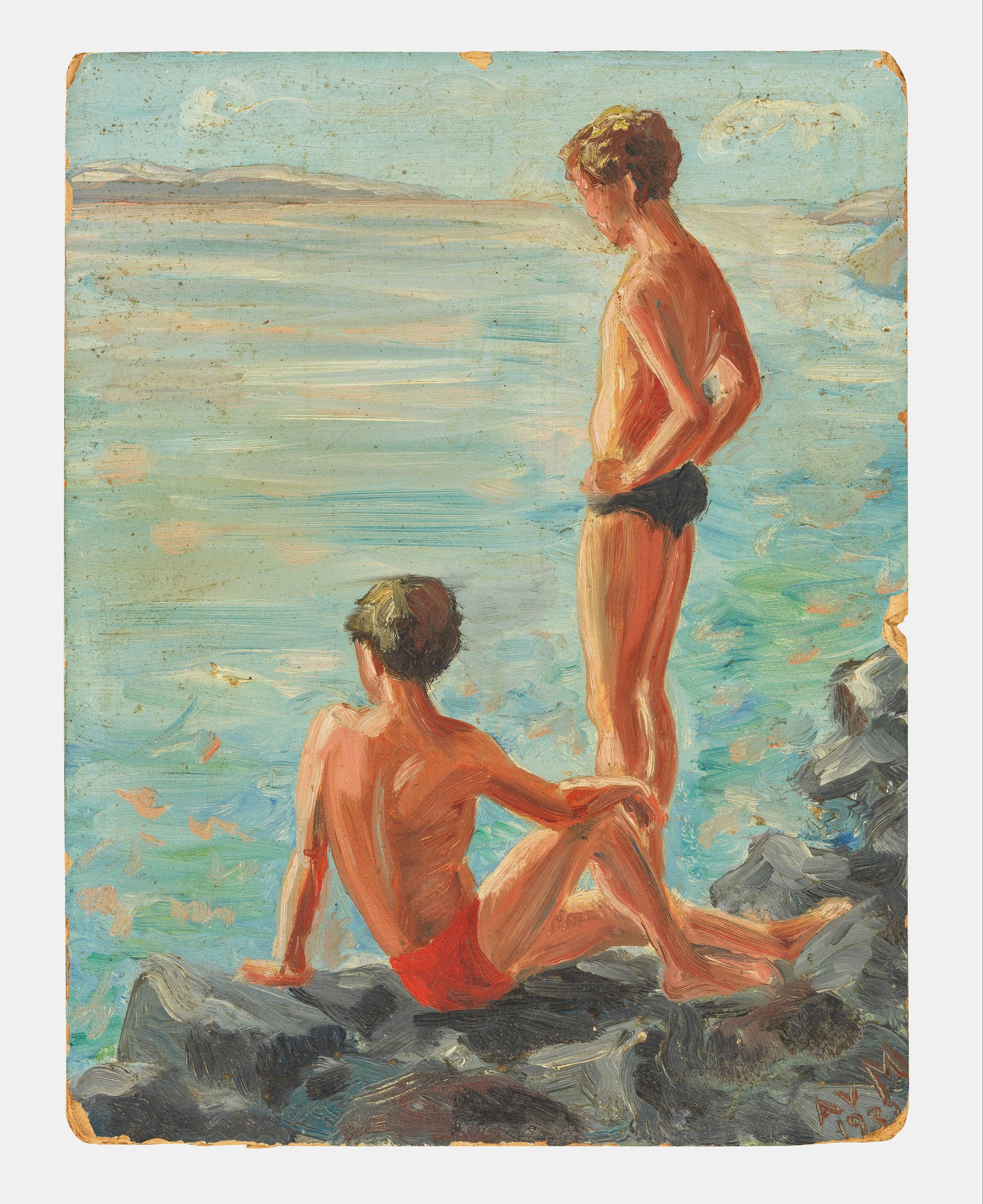 Garçons au bord de l'eau, huile sur carton, monogrammée AvM et d...