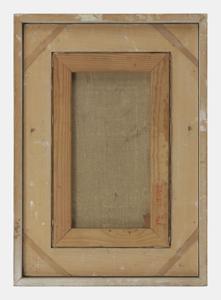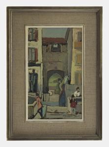 Scène de rue à Gruyères, acrylique sur toile, signée et datée 1965, 50,5x29,5 cm
