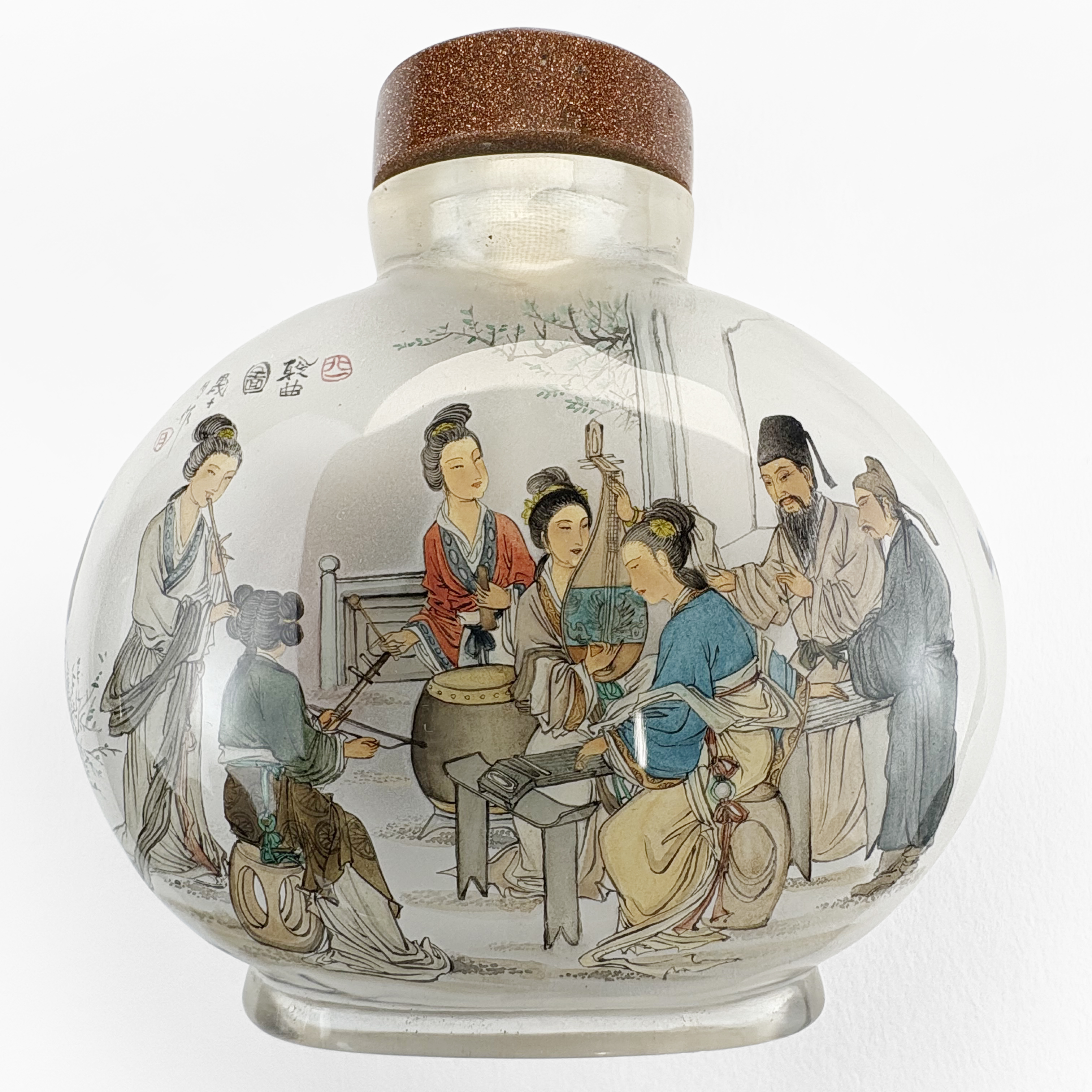 Verre à décor de personnages et calligraphie, bouchon en aventurine, H 9 cm