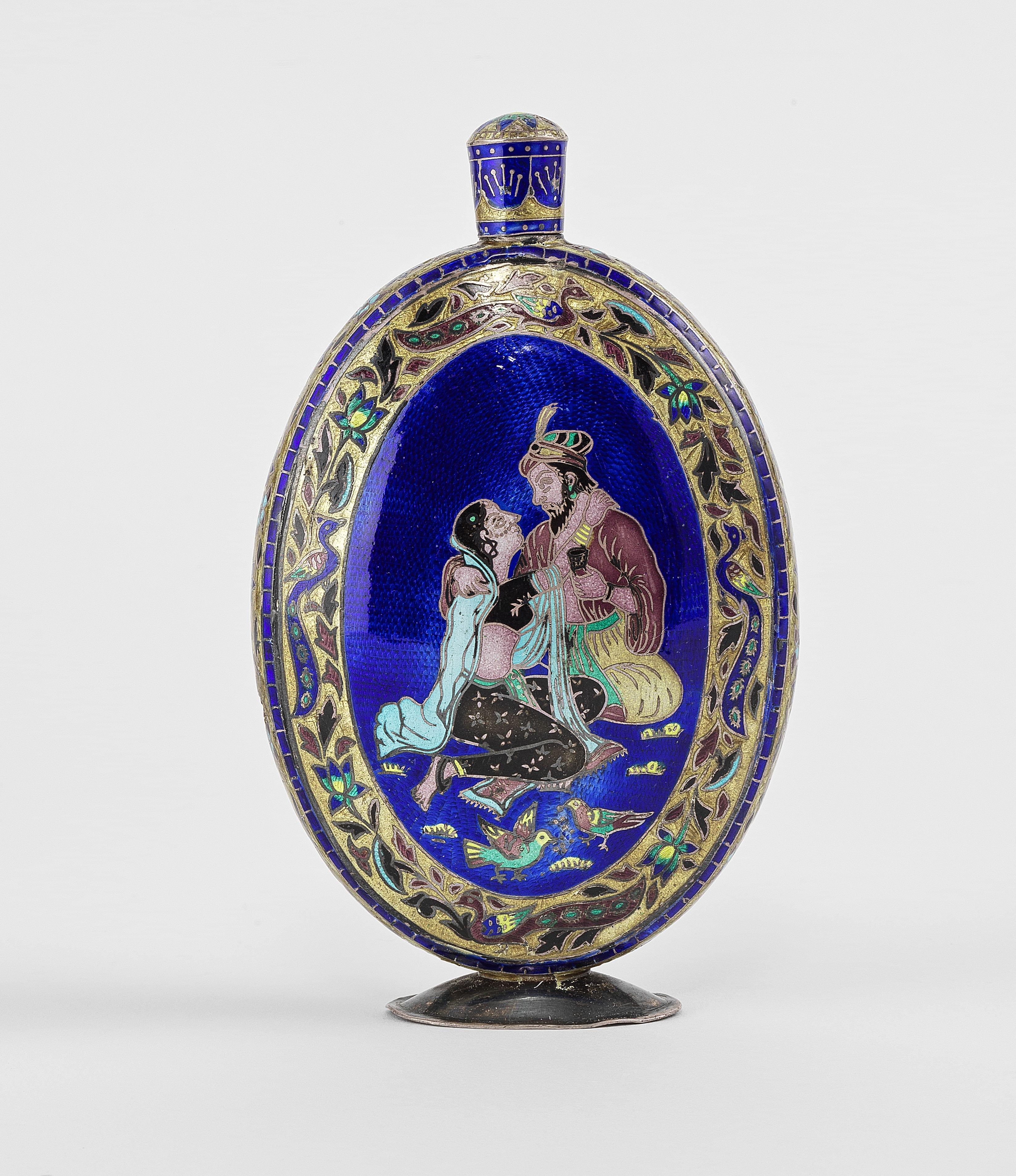 Argent et émail polychrome à motif d'un couple sur fond bleu nuit, H 16 cm