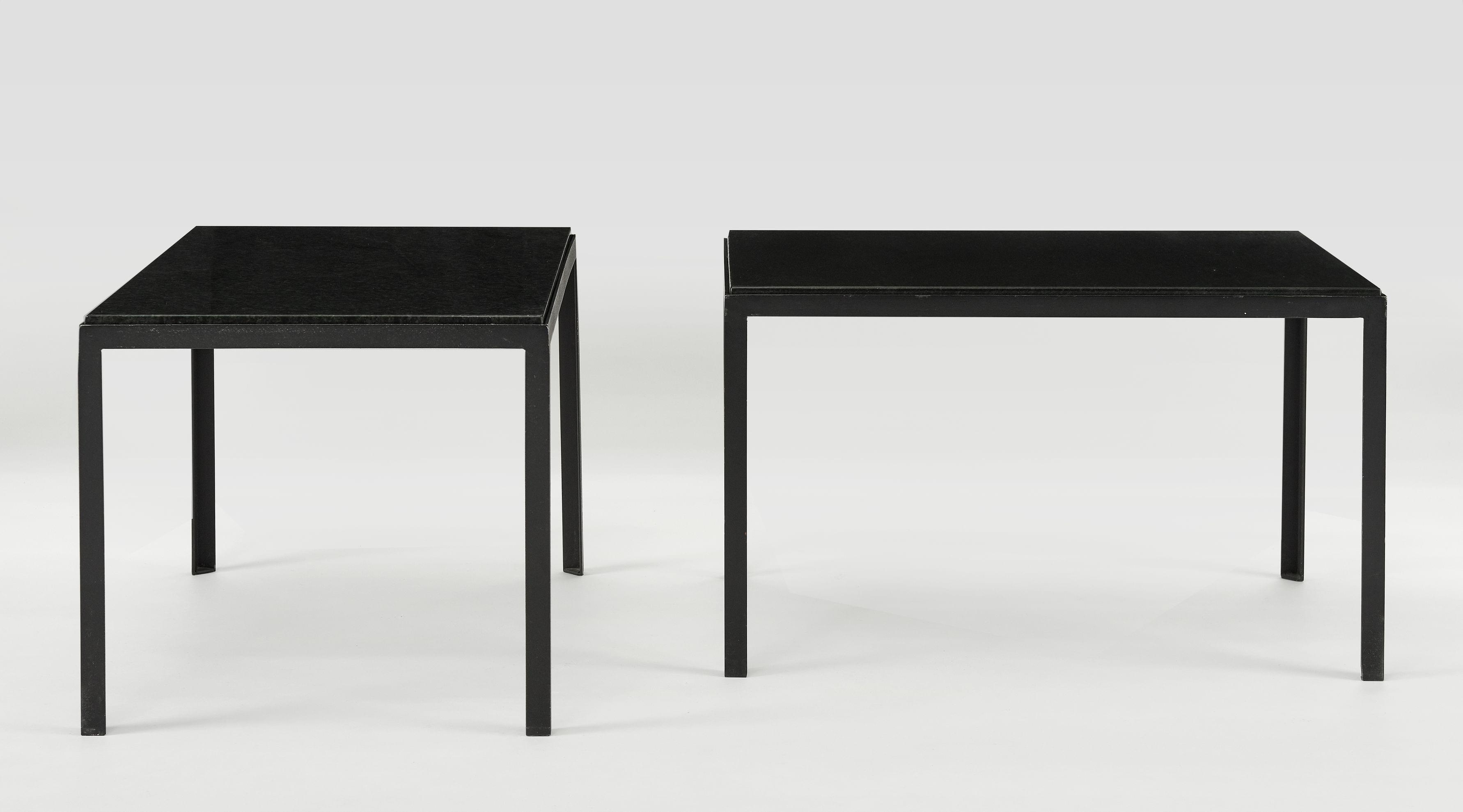Paire de bouts de canapé rectangulaires, granit noir et piètement en métal, 43x72x48 cm