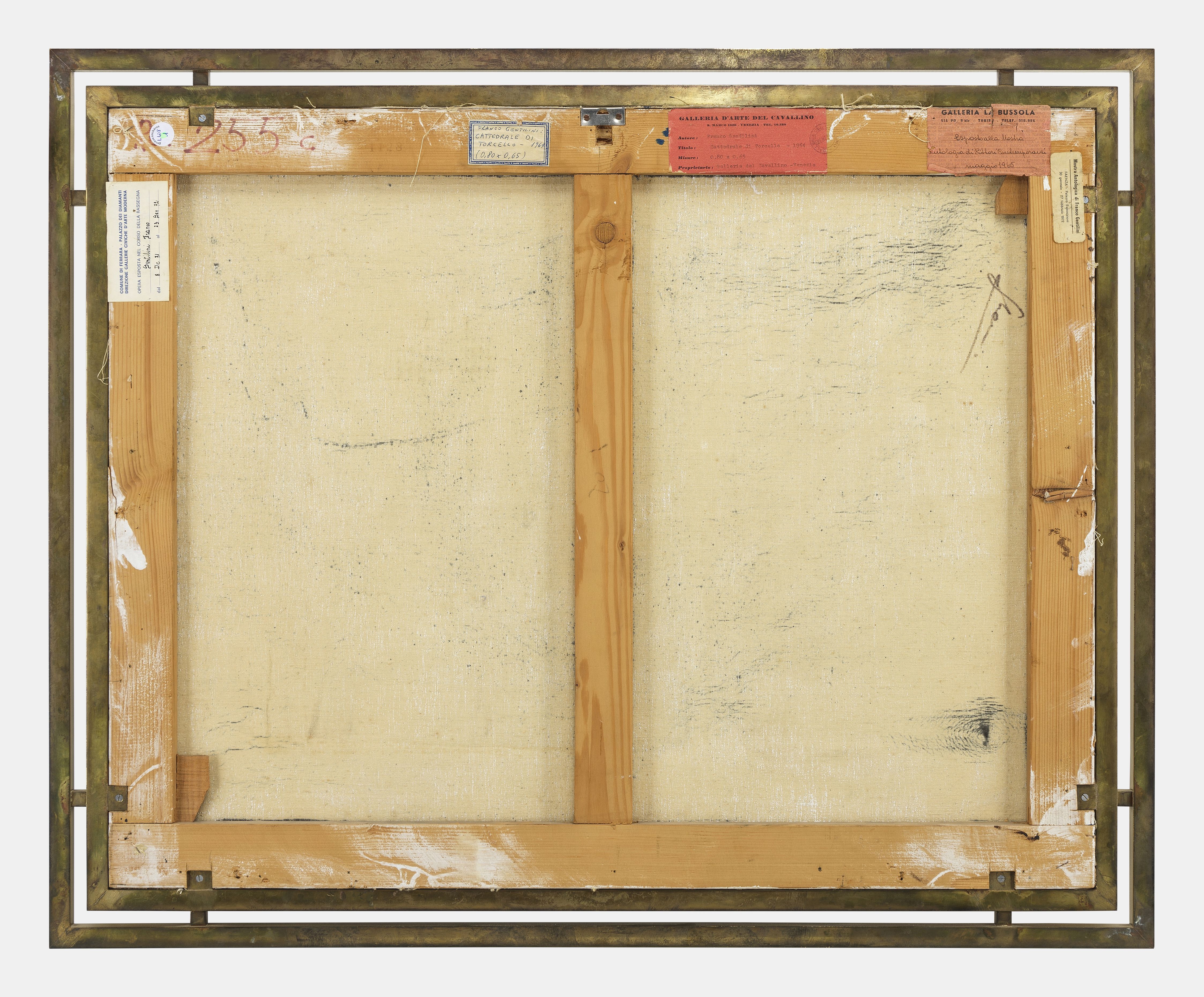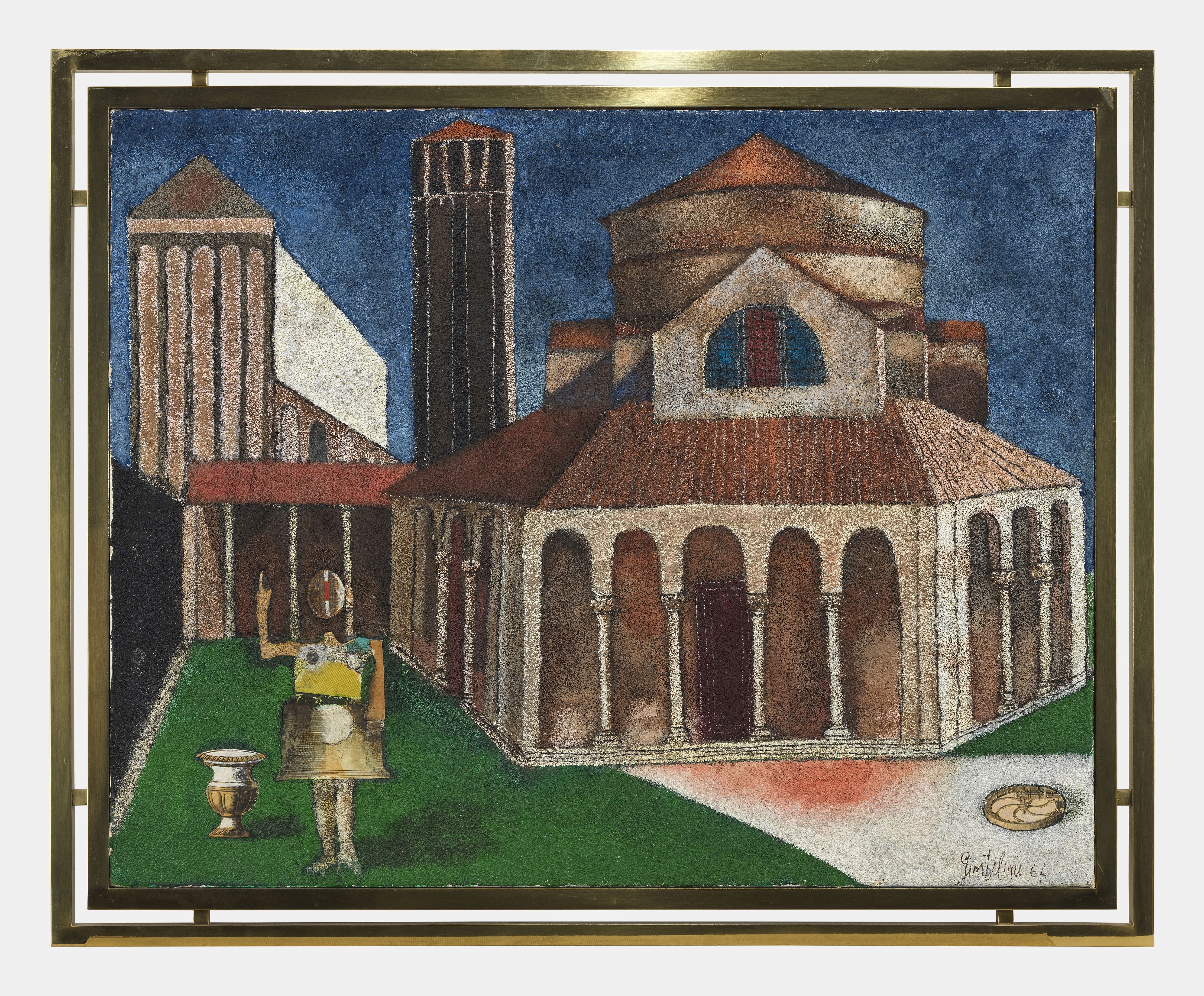 Cathédrale Santa Maria Assunta de Torcello, technique mixte sur toile, signée et datée 64, 64x80 cm. Etiquettes au dos : Galleria La Bussola, Turin; Galleria D'arte del Cavallino, Venise; Palazzo dei Diamanti, Ferrare.