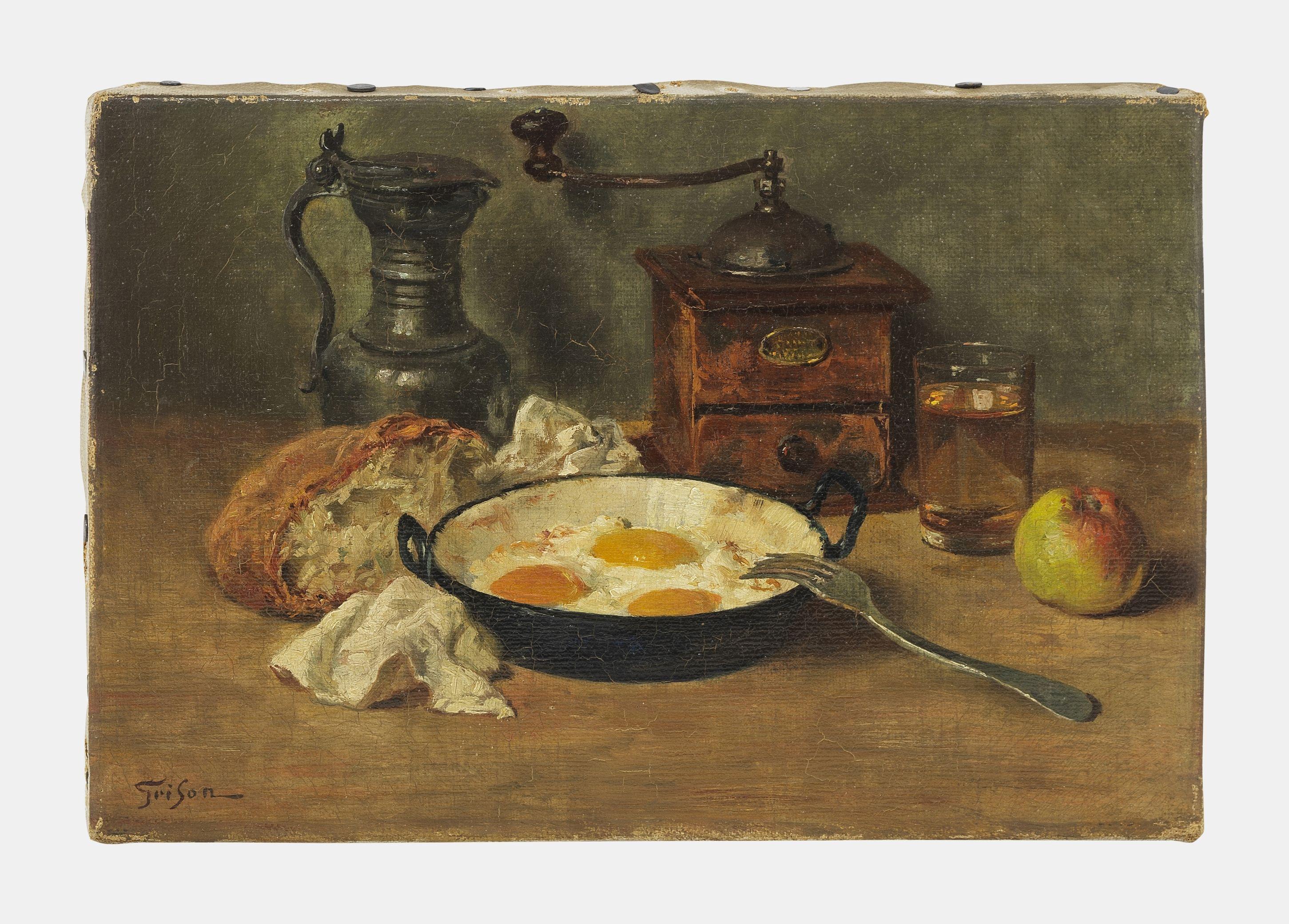 Nature morte au plat d'œufs, huile sur toile, signée, 15x23 cm