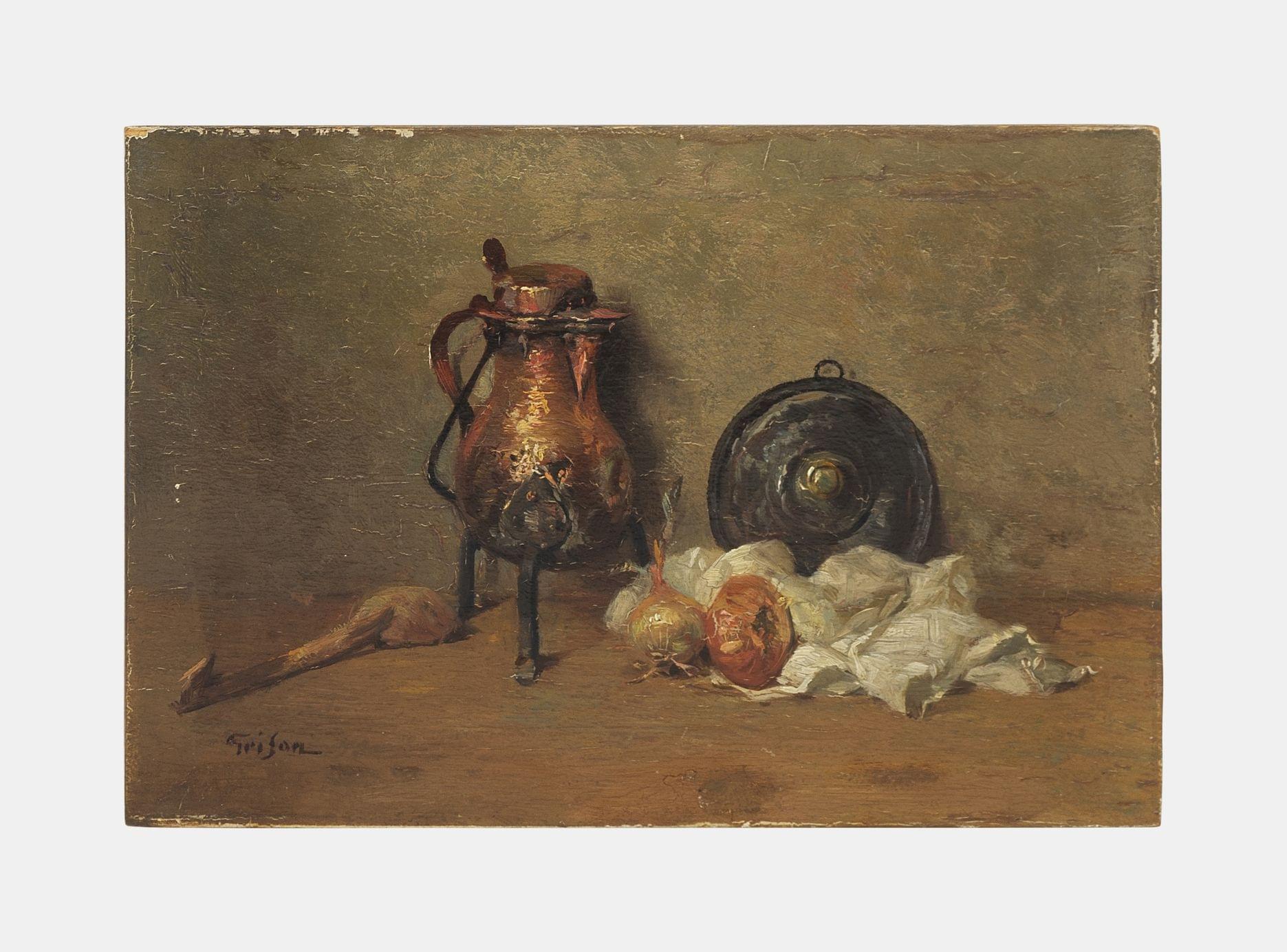 Nature morte aux oignons, huile sur panneau, signée, 10x14 cm
