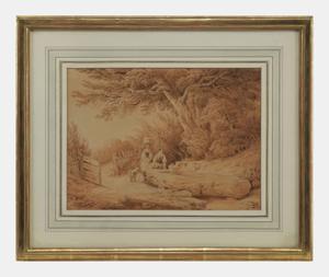 Paysans près d'une ferme, lavis bistre, signé, 18x27 cm