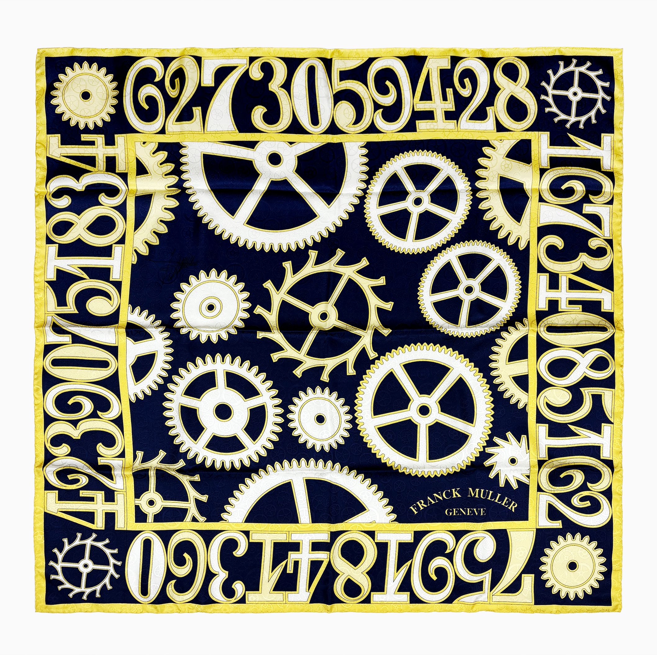Les deux à décor de rouages et de chiffres sur fond bleu marine et bordure jaune, soie, 86x86 cm