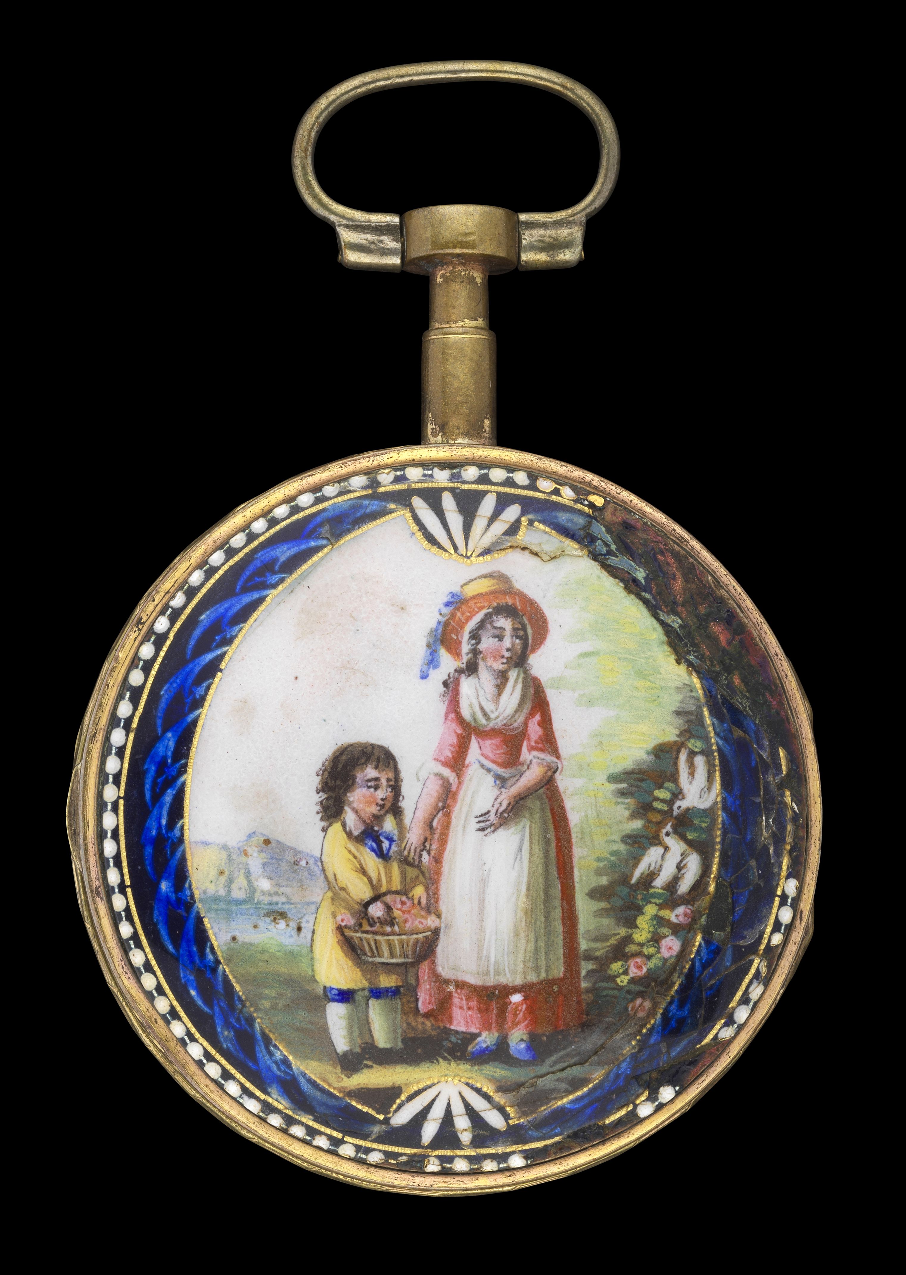 Cadran émaillé blanc, index en chiffres romains et aiguilles noirs, fond émaillé à décor d'une femme et d'un enfant, D 43 mm