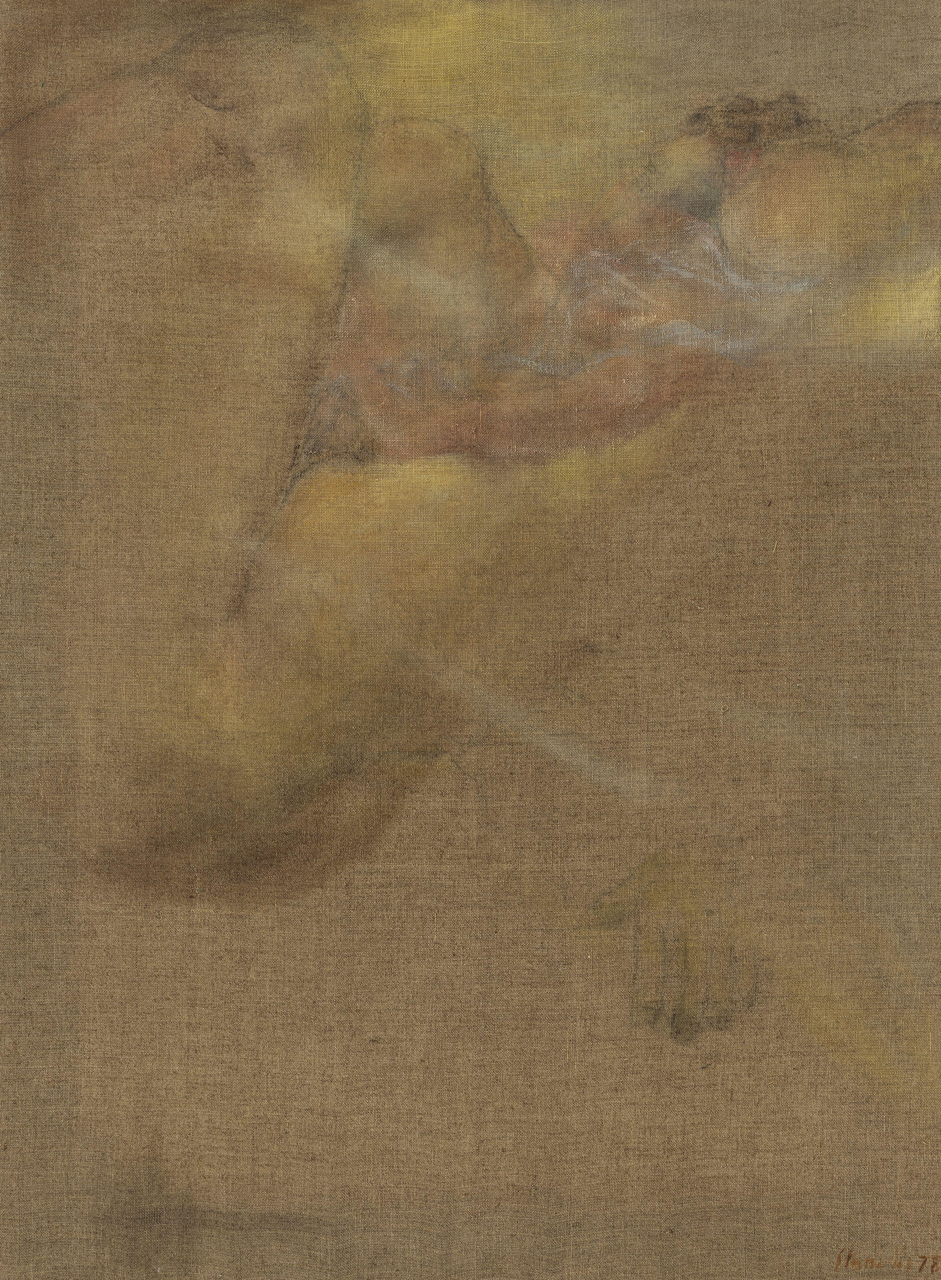 Couple couché, acrylique sur toile, signée et datée 78, 73 x 54 cm