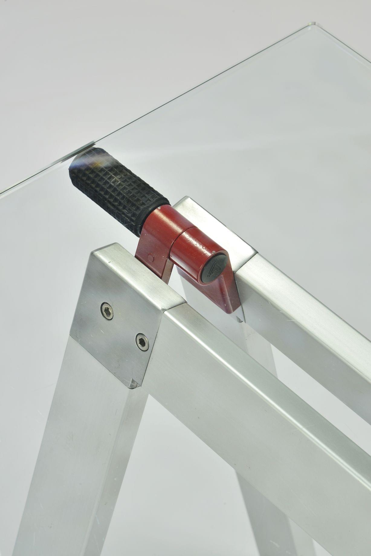 Table sur tréteaux tubulaires, aluminium et verre, 150 c 75 cm